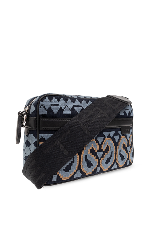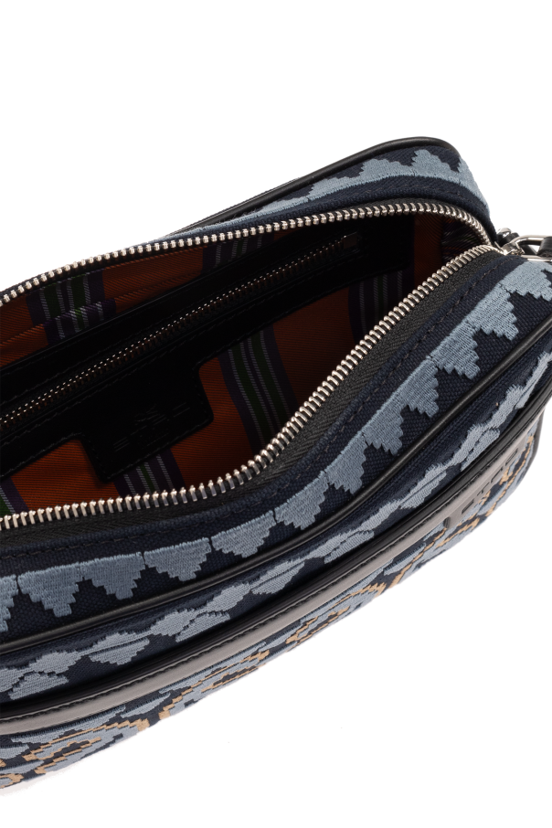 Introducing the quintessence of sophisticated accessorizing—the Etro Jacquard Shoulder Bag. Crafted with an exquisite blend of cotton and calf leather, this navy-hued masterpiece is adorned with intricate beige and black jacquard patterns, evoking an aura of timeless elegance. The motifs, reminiscent of ornamental shapes and a stylized infinity symbol, add a layer of depth and intrigue to the design. The bag\'s structure is a testament to impeccable craftsmanship, featuring a rectangular silhouette with defined edges and a secure zipper closure. A subtle yet striking feature is the designer\'s name, seamlessly integrated into the design on the front, signaling the exclusivity of the piece. The durable, wide strap is adorned with a repetitive pattern, possibly a signature of the brand, and is adjustable, ensuring optimal comfort and styling versatility. The interior reveals a sophisticated striped lining, enhancing the bag\'s refined aesthetic while offering ample space and organization options with additional pockets—ideal for safeguarding daily essentials. Why Purchase This Product? Exclusivity and elegance embodied in a unique jacquard pattern Luxurious materials: a harmonious blend of cotton, calf leather, and metal accents Adjustable, patterned strap for custom fit and comfort Spacious interior with organizational pockets, lined with a chic striped fabric Signature of luxury: subtle branding that distinguishes it as an Etro creation