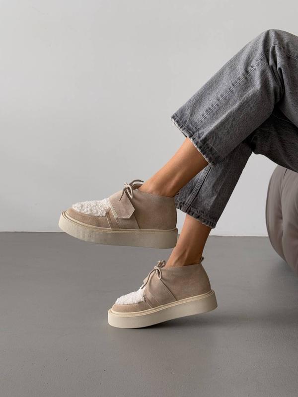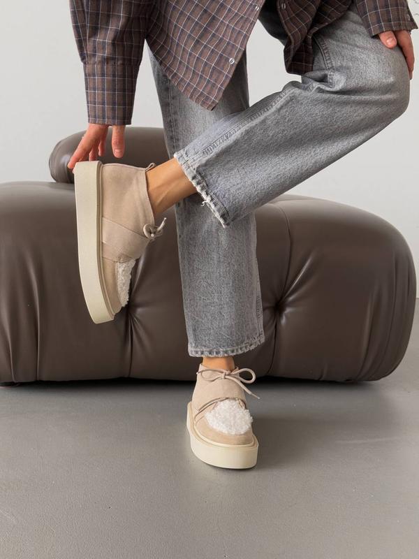 Код 11760 Лоферы регулируются липучкой и шнурком цвет: БЕЖЕВЫЙ НАТУРАЛЬНАЯ ЗАМША носик с мехом Teddy внутри: байка высота от пятки 7,5 \0см подошва: 3 см/позада 4 см Производство - Украина (NikArt) При отсутствии размера в наличии доступны под заказ 36= 23,3 см 37= 23,8 см 38= 24,5 см 39= 25,5 см 40= 26 см