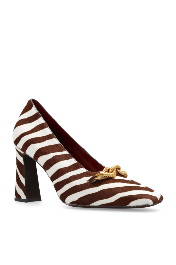 Dark brown and cream ‘Jessa’ pumps from Tory Burch. Made from calf leather trimmed with zebra-printed hair, this model sits on a dark brown leather sole and features a square toe accompanied by a gold-tone application.