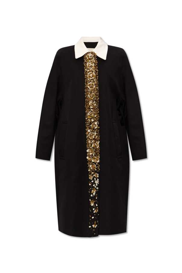 Introducing the striking Dries Van Noten Black and White Coat, a masterpiece of modern tailoring that exudes sophistication with a daring twist. Crafted from a premium blend of wool, linen, and polyamide, this outerwear is a testament to the high-quality craftsmanship inherent to the Dries Van Noten brand. This avant-garde piece captivates with its short-sleeved design, an unconventional choice that adds a unique flair to the traditional coat silhouette. The garment\'s elegance is further enhanced by a crisp white collar that stands in contrast against the deep black fabric, creating an alluring visual dichotomy. At the heart of its design, a vertical stripe adorned with opulent gold and pearl appliqués draws the eye, symmetrically aligned along the coat\'s closure. These meticulously placed embellishments, featuring pearls, sequins, and beads, weave together to form an exquisite pattern that radiates luxury. Its straightforward cut, devoid of a defined waist, suggests a slightly oversized style, offering both comfort and a touch of modernity. The front pockets, likely with closures, add practicality without sacrificing the coat\'s sleek aesthetic. Why Purchase This Coat? Unparalleled blend of elegance and originality, with its short sleeves and contrasting collar. Luxurious gold and pearl appliqués that elevate the garment. Crafted from a high-quality blend of wool, linen, and polyamide, ensuring durability and comfort. Practicality meets style with its secure front pockets and easy button closure. An expression of avant-garde fashion, perfect for those looking to make a bold statement.