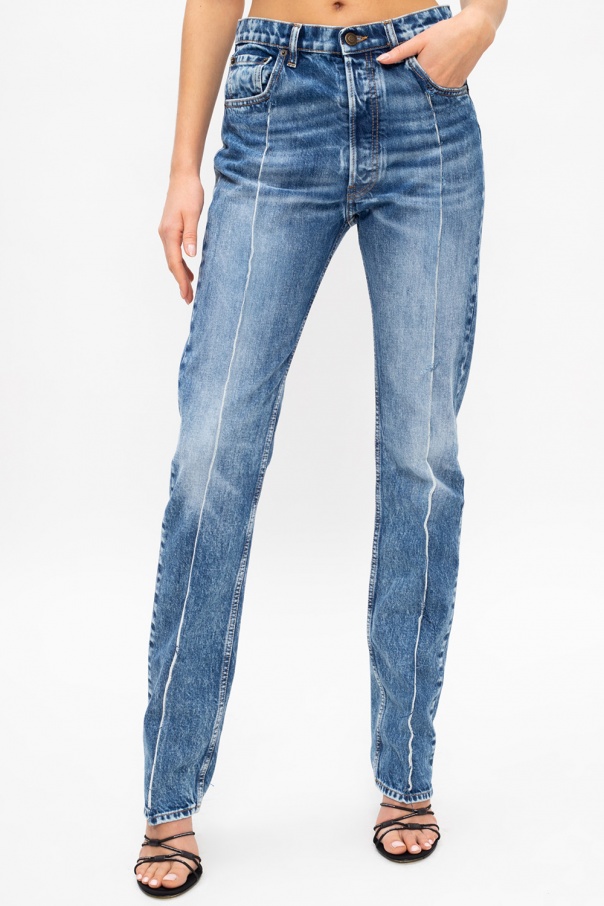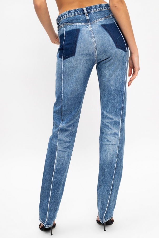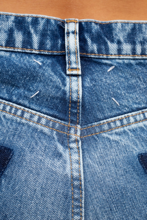 Blue jeans from Maison Margiela. Crafted from stonewashed cotton denim, this pair falls down with slightly tapered legs and employs button closing, three front pockets, distinctive seams, raw edges and pocket-less back.