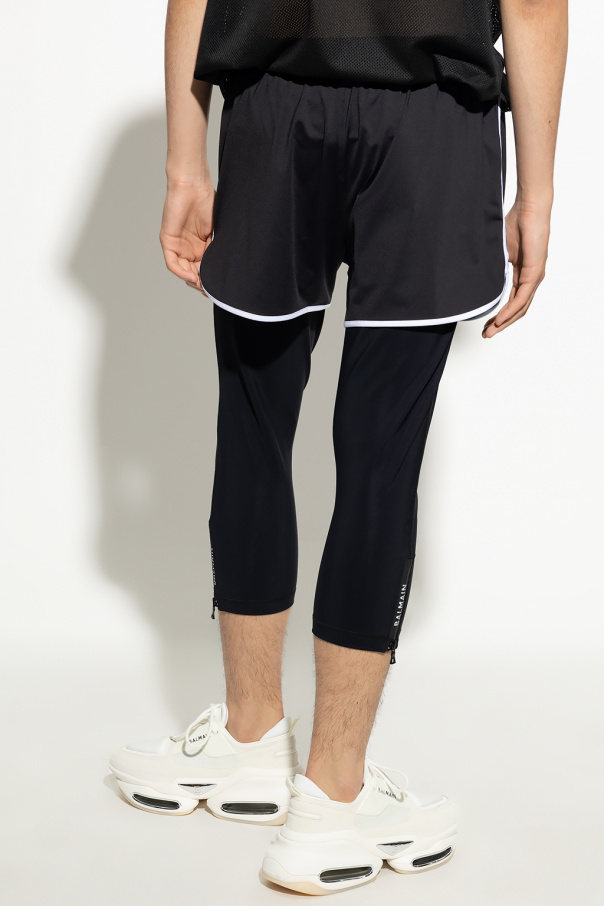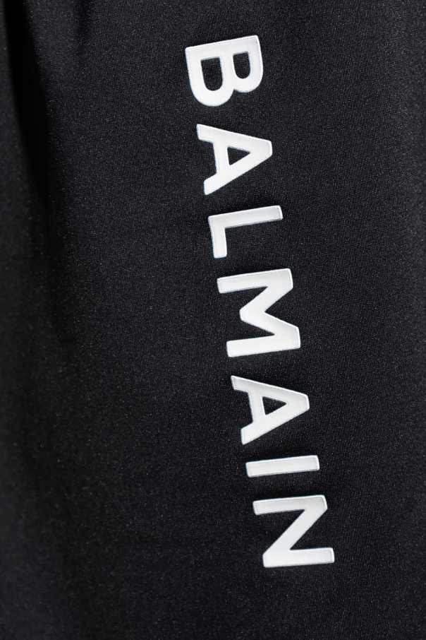 Black training shorts from Balmain. Printed with the brand\'s logo, this pair features an elastic waistband and white piping.