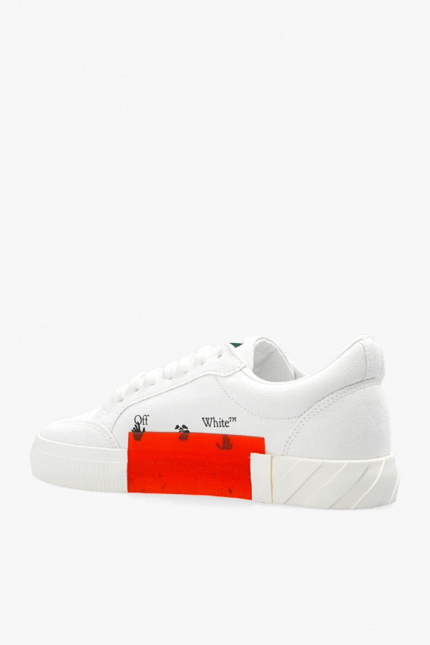 White ‘Low Vulcanized’ sneakers from Off-White. Crafted from canvas, this lace-up pair features logo prints, Arrows patch, the label’s signature zip tie in dark green and white sole with a transparent insert in orange and raised stripe pattern.