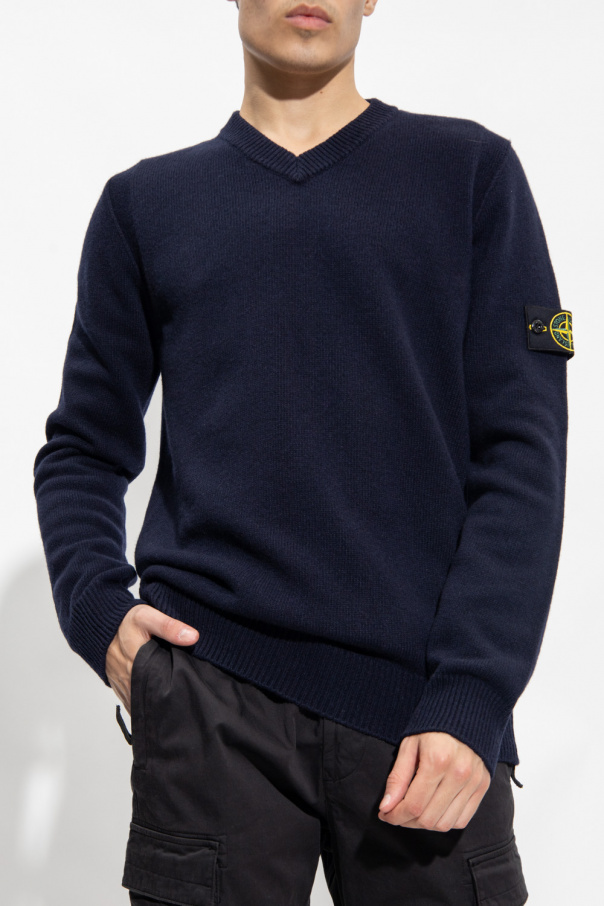Navy blue sweater from Stone Island. Crafted from wool, this style features a V-neckline, long sleeves, ribbed trims on the edges and a black, yellow and green logo patch.