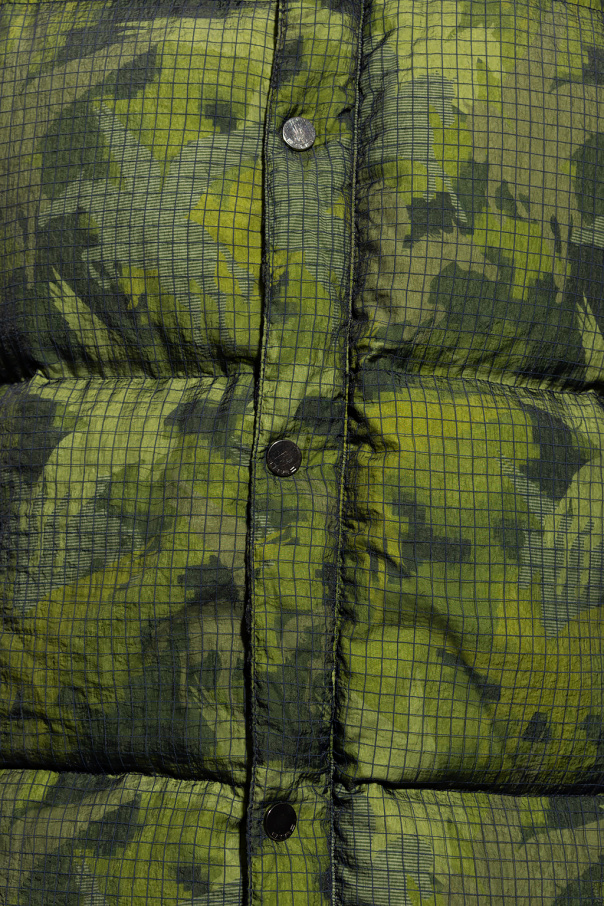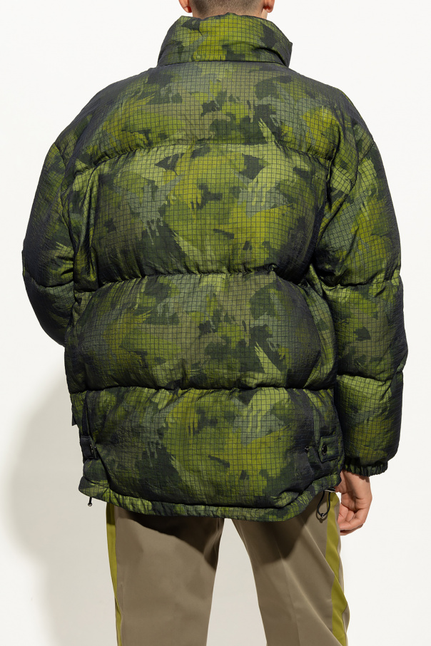 Green and black down jacket from Etro. Fastened with pleated snaps and two-way zip, this garment is decorated with a camo pattern and the label’s signature Pegaso motif. It is complete with a tag with a logo, black transparent layer with a check pattern, two zip pockets, long sleeves with ribbed cuffs as well as a drawstring hem and snap fastenings.