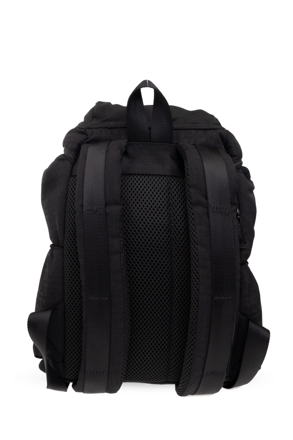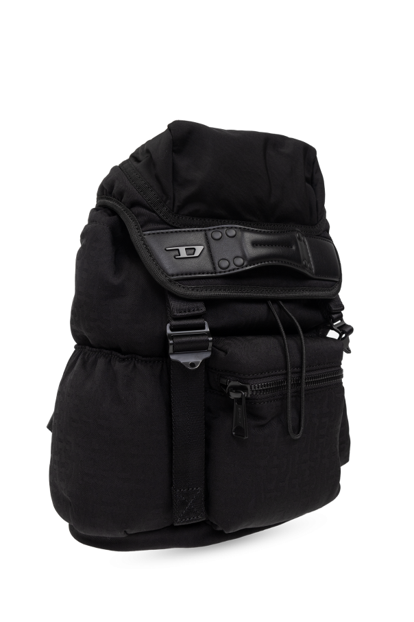 Black backpack from Diesel. Crafted from monogrammed technical material and trimmed with faux leather, this design adjusts via snaps and features a frontal handle accentuated with a metal logo plaque. It is complete with a top handle, adjustable shoulder strap, one zip pocket on the front, two slip pockets on the sides, silver-tone metal hardware and a drawstring interior with a slip pocket.