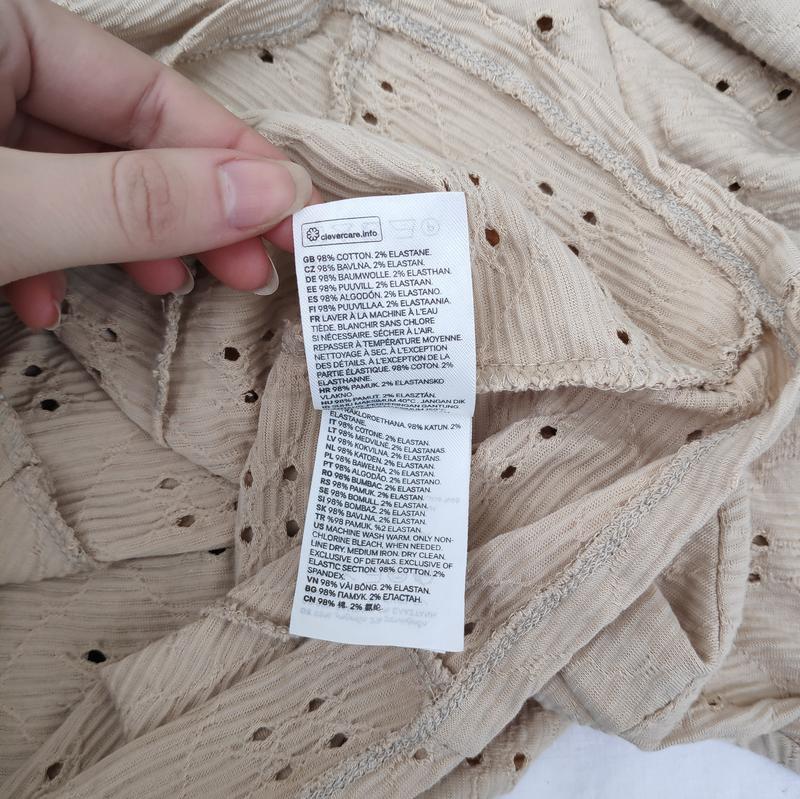 Приталенная блузка из эластичного джерси с английской вышивкой. V-образный вырез, потайные пуговицы спереди и короткие объемные рукава-буфы на резинке. 🥰 Размер указан: L ПОГ - 48 см Длинна сзади (по центру спинки) - 52 см Замеры сделаны в спокойном состоянии, не растягивая 🤗 Состав: 🌟 98% cotton 🌟 2% elastane За дополнительной информацией - пишите, буду рада помочь 🙂 Смотрите также другие мои объявления и подписывайтесь ✨