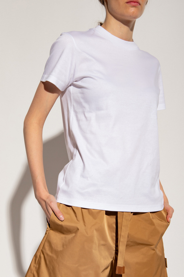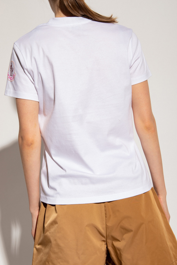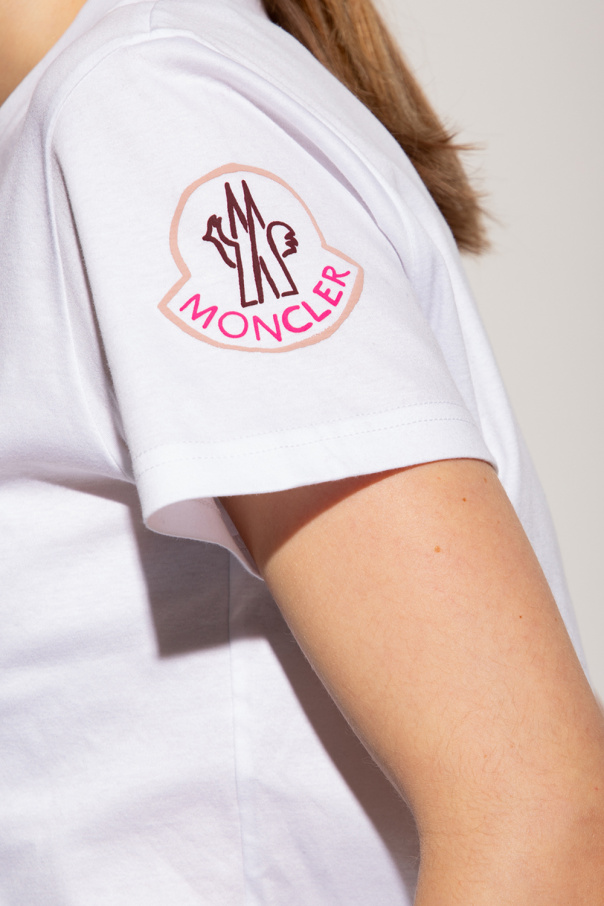 White crewneck T-shirt from Moncler. Made of cotton, this style features short sleeves, an elasticated collar, a pink and purple graphic print with the brand\'s logo.