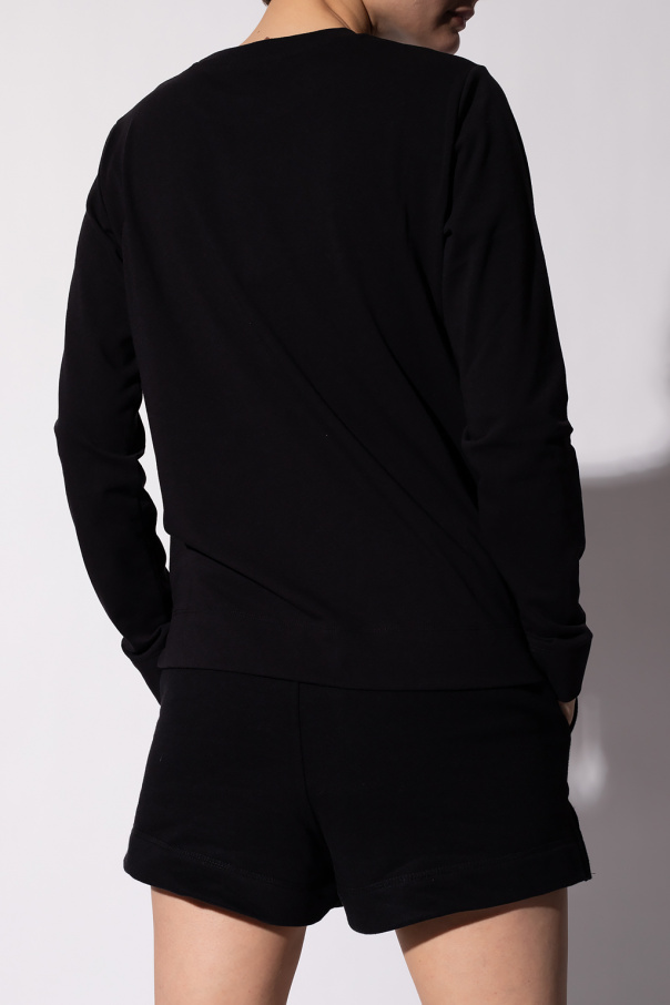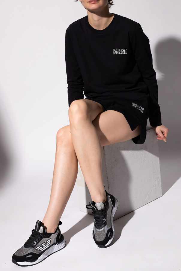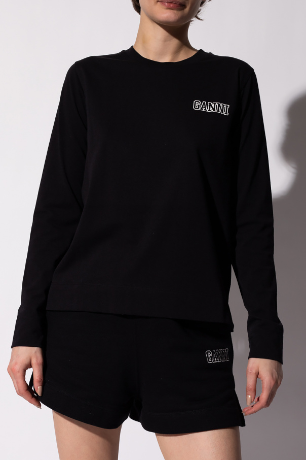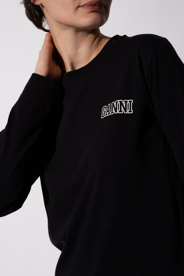 Black crewneck T-shirt from Ganni. This long-sleeved garment features a green logo embroidery and side slits.
