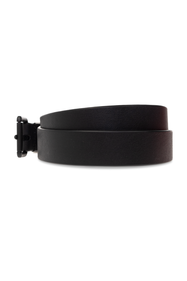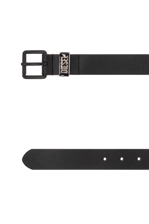 Black belt from Diesel. Made of bovine leather, this item fastens with a logo buckle in silver-tone and black.
