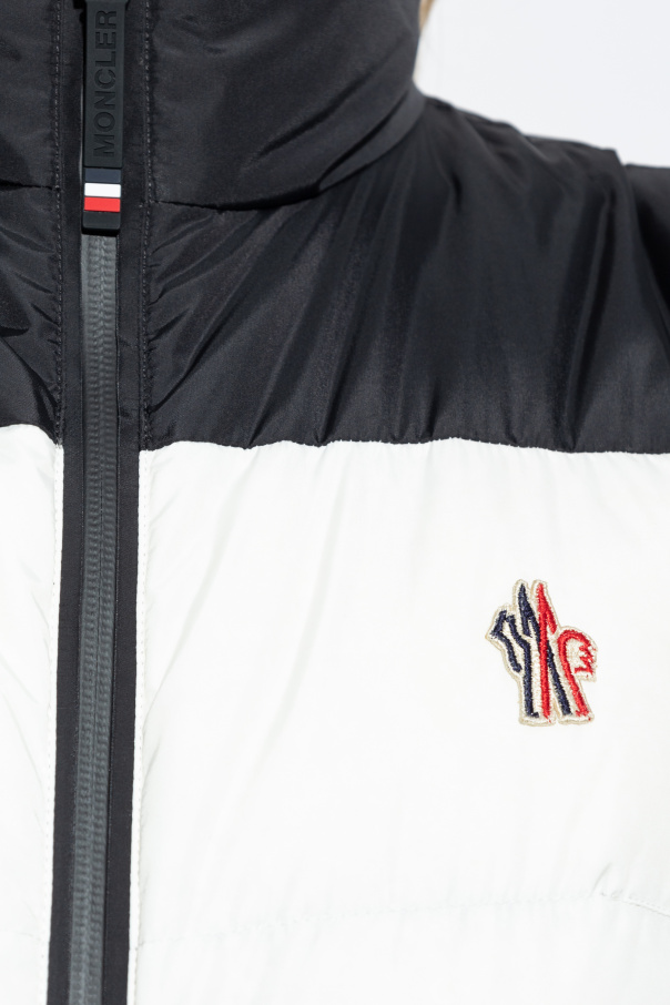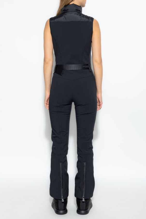 Introducing the MONCLER GRENOBLE PERFORMANCE & STYLE ski jumpsuit, an epitome of elegance and sophistication. This masterpiece from the illustrious Moncler Grenoble collection captivates with its black hue complemented by a contrasting white panel, exuding a contemporary allure. Crafted with precision, this sleeveless jumpsuit features a high collar and a full-length zipper, ensuring ease of wear and freedom of movement. Its tailored fit, accentuated by a waist belt, elegantly highlights the silhouette, embodying the brand\'s commitment to merging functionality with high fashion. Detailed with a subtle Moncler logo on the white panel, this piece is a testament to the brand\'s prestige. The lower leg zippers ensure adaptability to ski boots, enhancing its practicality for outdoor adventures. Why choose this product? Exquisite blend of polyester, polyamide, and elastane for superior quality. Combines chic style with outdoor functionality. Iconic Moncler design for a statement look.