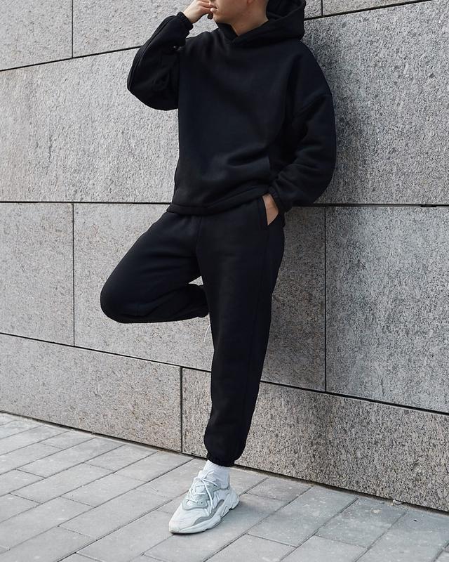 Размеры: S, M, L, XL - Цвета: черный - Свободная посадка(овресайз). - Турецкая трехнитка с начесом премиум качества. - Сезон: осень-зима - Качественный пошив и фурнитура. - В поясе резинка со шнурком. - Внизу манжет. - Внутренние карманы на худи