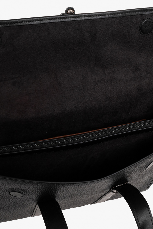 Black shoulder bag from Coach. Made of grained leather, this model features a flap with a magnetic closure and is decorated with an embossed logo. It is complete with a back pocket, half-round handle with a snap-fastened strap, detachable and adjustable shoulder strap, detachable branded keyring, dark silver-tone metal hardware and two separate internal compartments with a zipped partition and four slip pockets.
