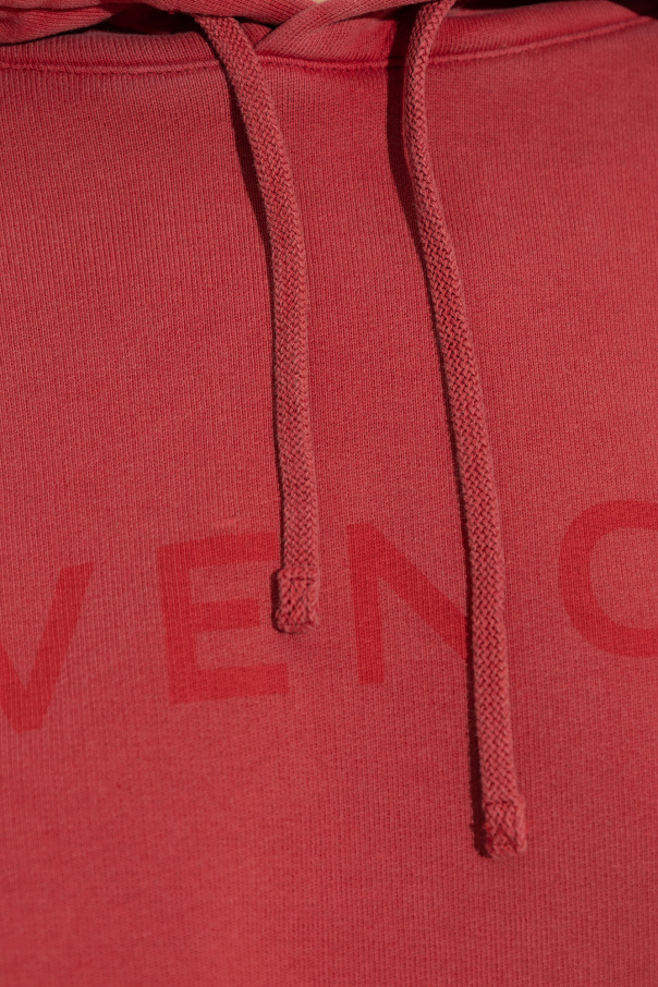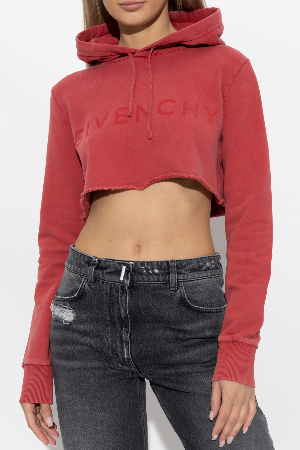 Red sweatshirt with a drawcord-adjustable hood from Givenchy. Crafted from cotton jersey with a cropped fit, this style showcases a logo pattern, long sleeves with elasticated cuffs and a raw trim on the bottom hem.