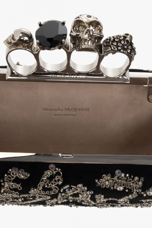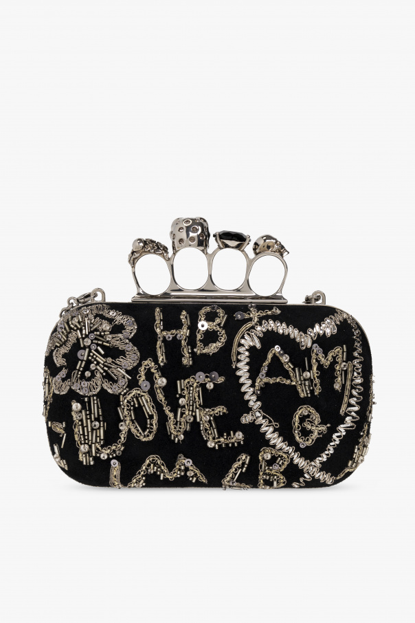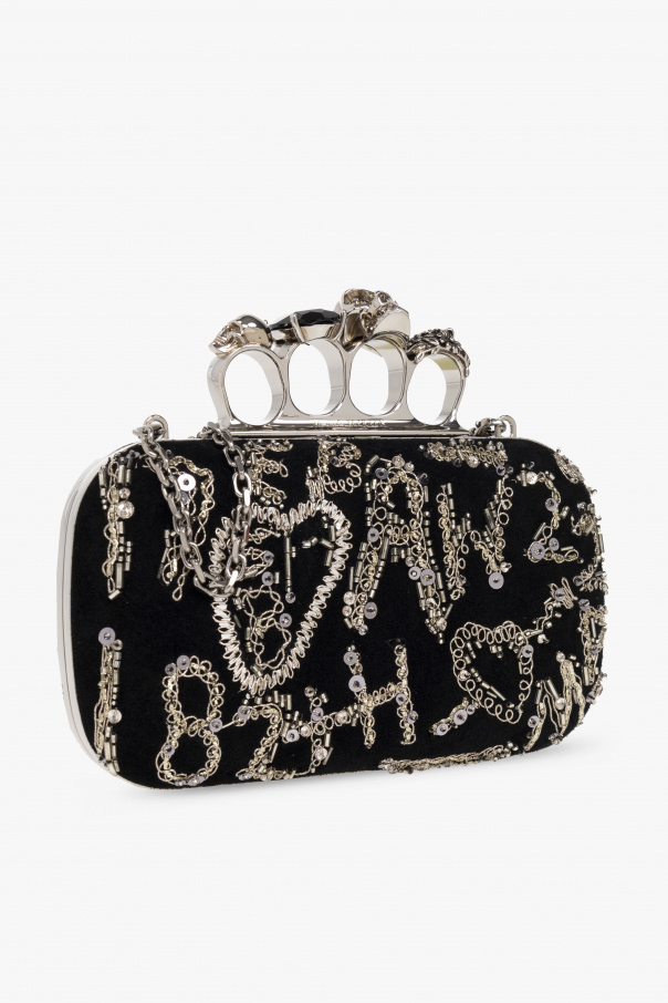 Black ‘Skull Four-Ring’ clutch from Alexander McQueen. Made of suede, this model fastens with snaps and is complete with silver-tone beads, decorative ring handle with the iconic skull motif and crystals, detachable chain, beige suede lining, one internal compartment and silver-tone metal hardware.
