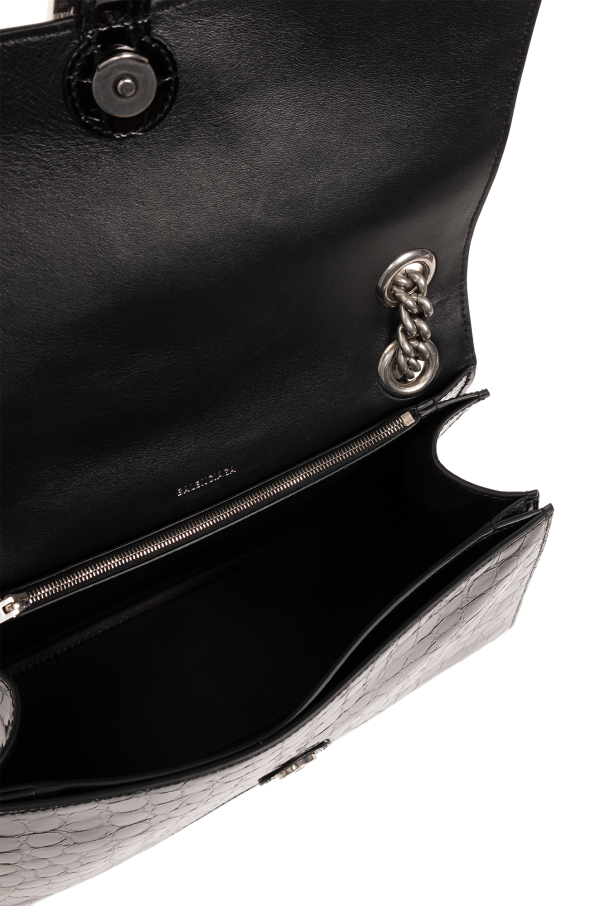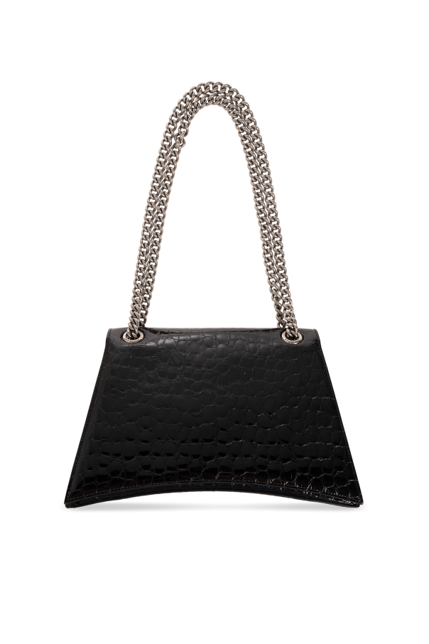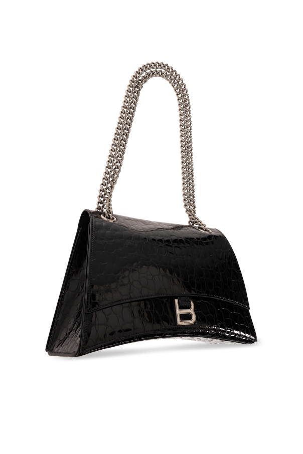 Black ‘Crush Medium’ quilted shoulder bag from Balenciaga. Crafted from patent calf leather with a crocodile skin effect, this model is complete with a snap closure, flap with a logo-engraved B charm, double chain, silver-tone metal hardware and one internal compartment with two slip pockets and one zip pocket.