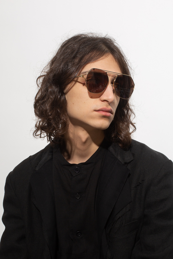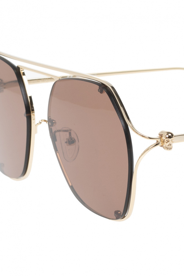 Gold-tone sunglasses from Alexander McQueen. Made in metal, this pair features a double-bridge design, decorative temples accentuated with the brand\'s signature skull application and an engraved logo as well as certified brown lenses with protection against detrimental UVA/UVB rays. Black case with an embossed logo included.