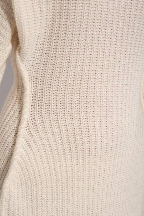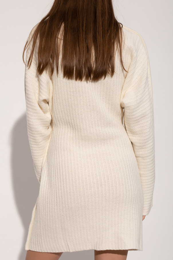 Cream ‘Echo’ turtleneck dress from Holzweiler. Made of chunky yarn, this fitted garment has long rounded sleeves.