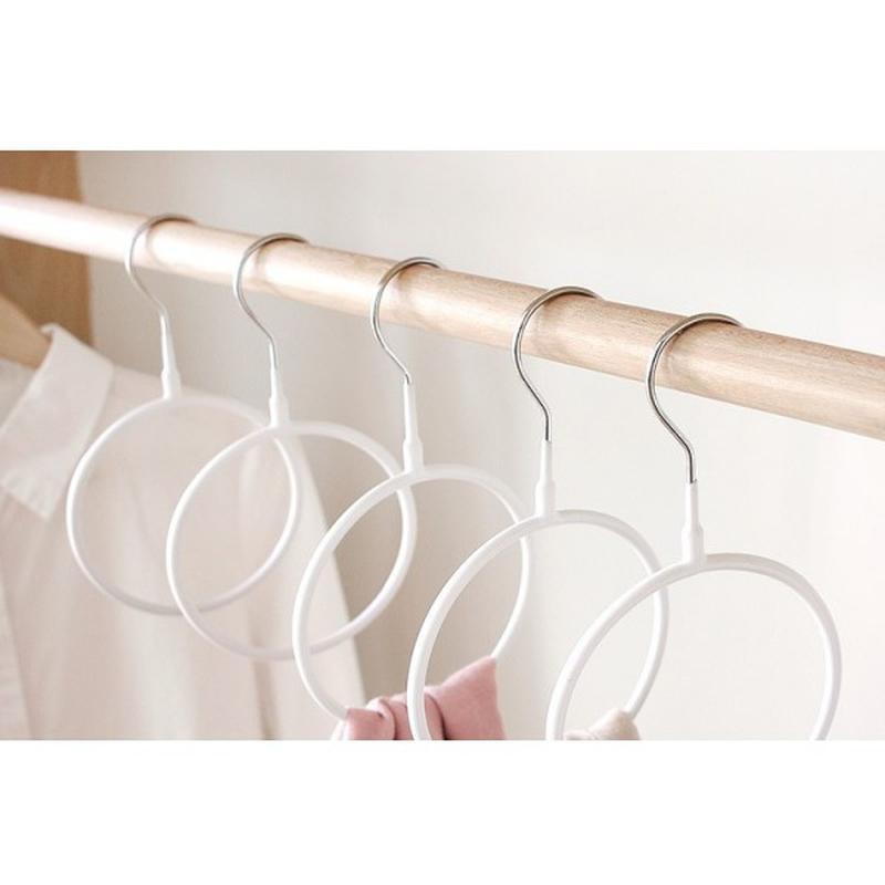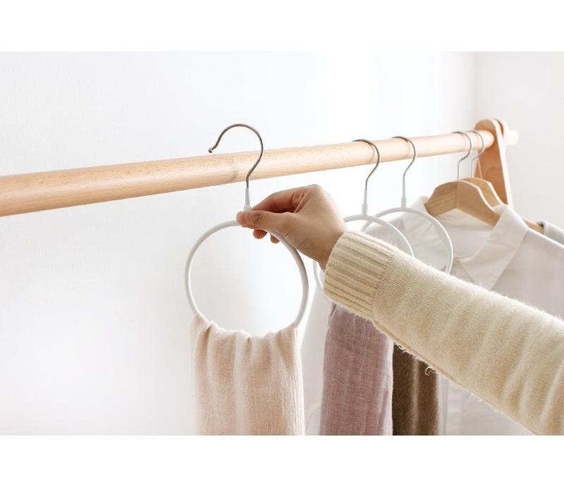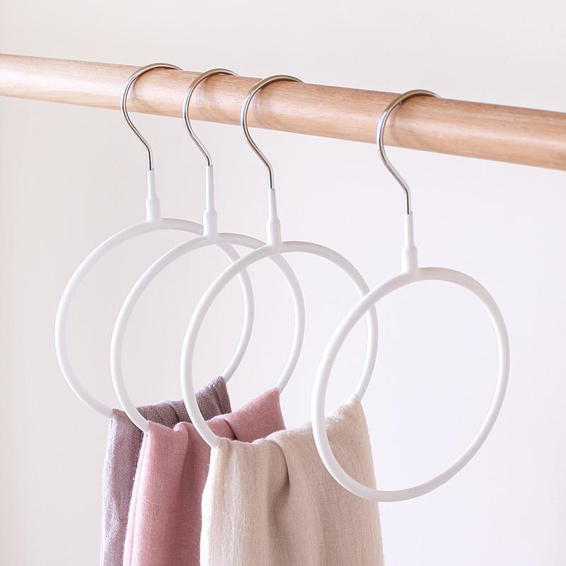 Органайзер-кольцо для удобного хранения шарфиков, палантинов, платков, парео и шалей. Нежные тканевые аксессуары весьма неуд\0обно хранить в сложенном виде на полке. Если Вам понадобится шарф или платок, находящийся посередине стопки, то придется нарушить всю «конструкцию», чтобы его достать. Самый оптимальный вариант для размещения большого количества таких вещей – это кольцо, которое подвешивают на штанге среди остальных плечиков для одежды. Кроме того, что вещи не мнутся, хранясь в расправленном виде, вешалка позволяет быстро подобрать нужный атрибут, приложив его к одежде, даже не вынимая из шкафа. Кольцо изготовлено из высокопрочной стали и покрыто глянцевым пвх.