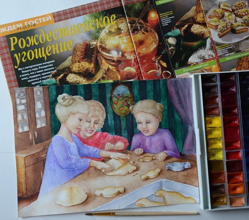 В гостях у бабушки всегда интересно, особенно когда бабушка учит внучек шить, вышивать или печь что-нибудь вкусное)) Именно об этом эта картина акварелью. Рисунок можно оформить в паспарту или просто под стекло.