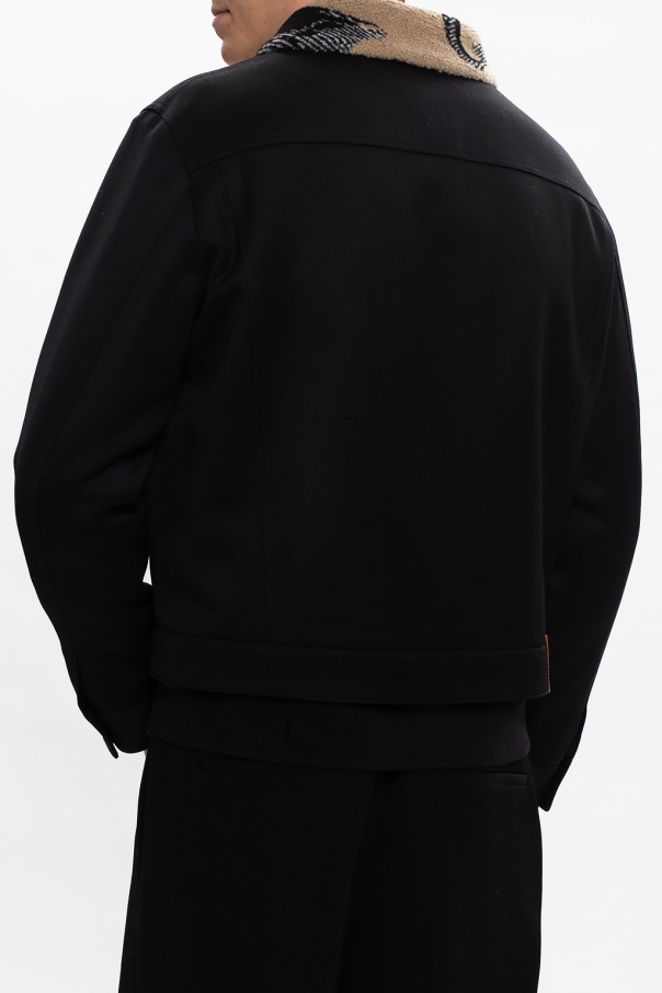 Black and brown jacket from Loewe. Crafted from wool and finished with a faux-fur fleece, this style fastens via buttons and showcases a brown patch which was embossed with the brand\'s logo, two side welt pockets and two flapped pockets with button closures on the chest.