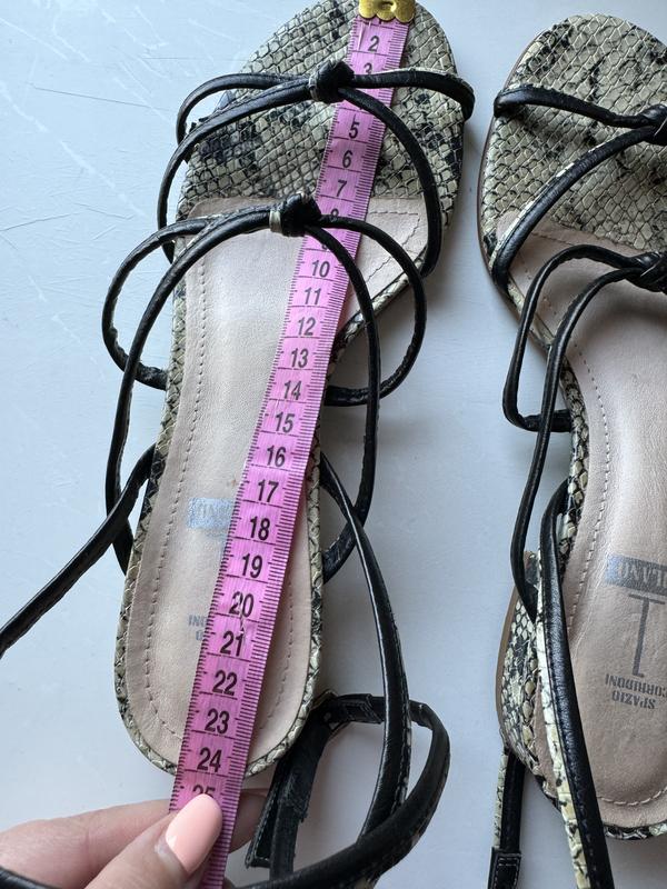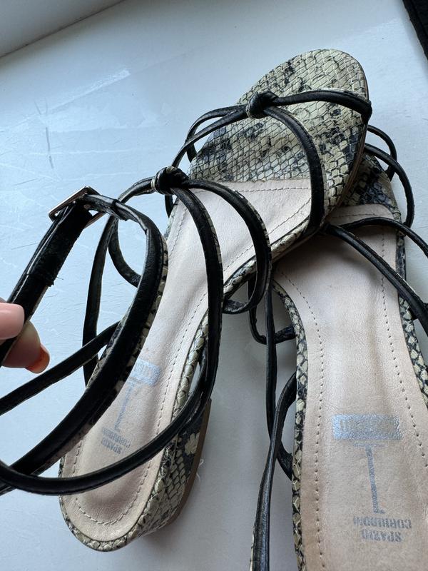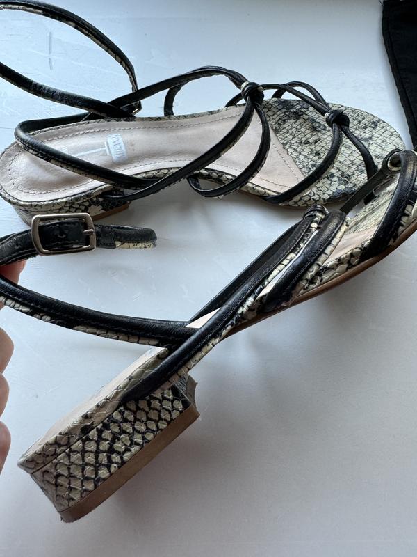 В дуже хорошому стані Супер зручні, красиві, устілка шкіряна, ремінці не знаю, мабуть, теж шкіра Бразилія Каблук 2 см