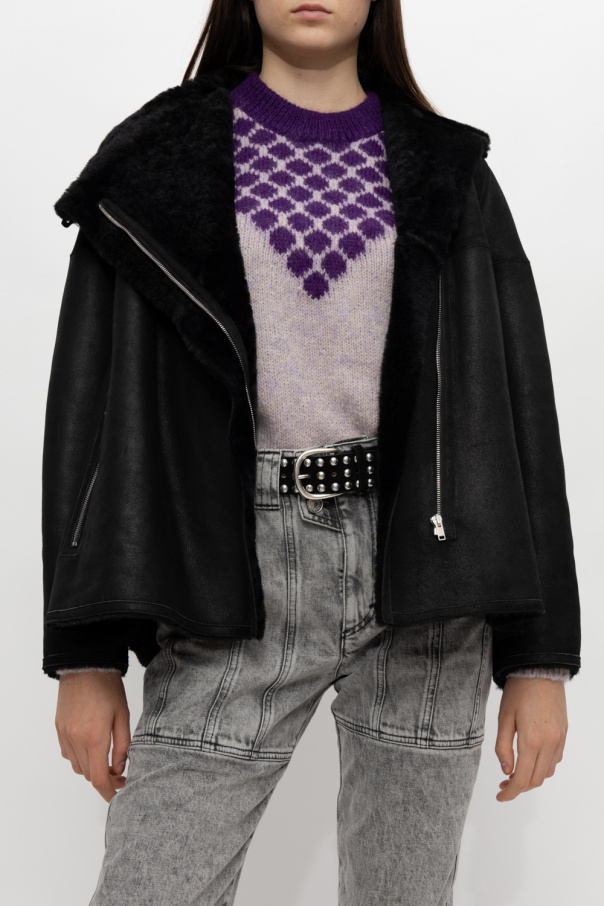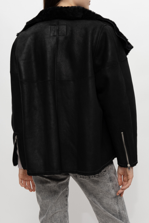Black ‘Abeliki’ shearling coat from Isabel Marant. Crafted from leather and lamb fur, this style features a front zip fastening, two zip pockets and long sleeves with zipped cuffs.