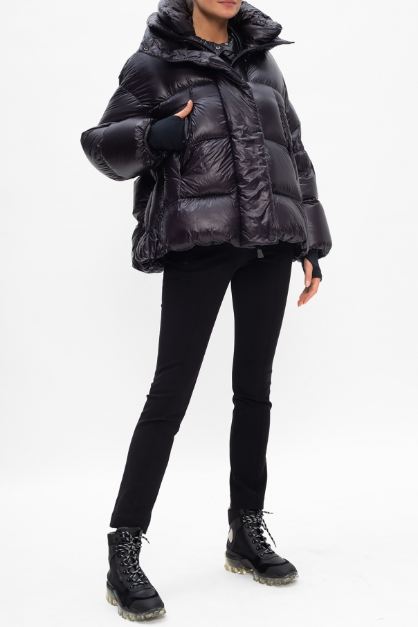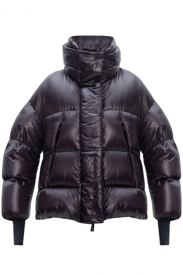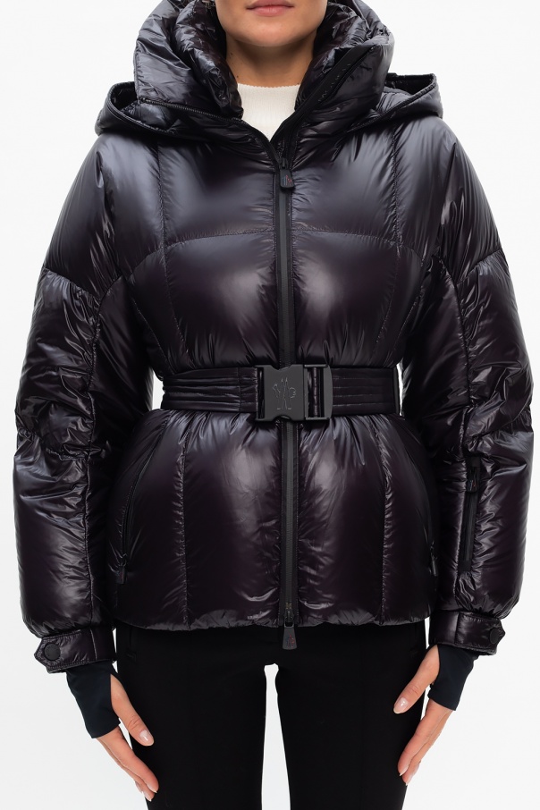 Black \'Arpuilles\' quilted jacket with a hood from Moncler Grenoble. Filled with goose down, this winter-savvy garment offers superb insulating properties and showcases logo appliqué for the brand recognition. It is complete with two-way zip and snap fastenings, two snap-fastened frontal pockets and a drawcord-adjustable hem