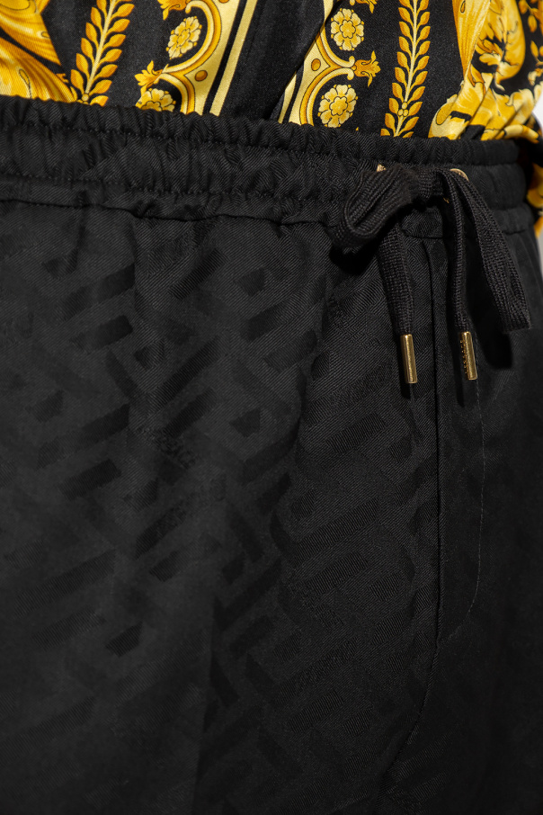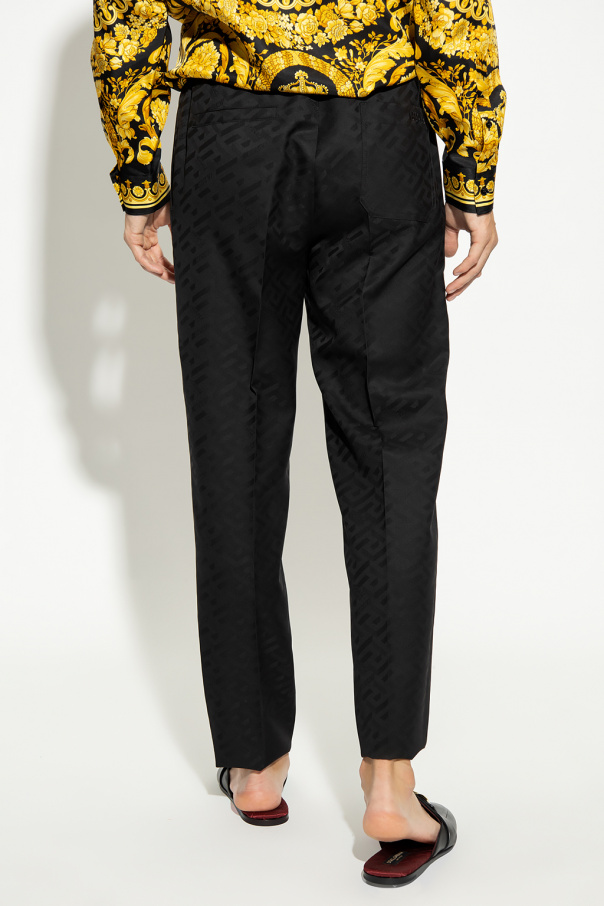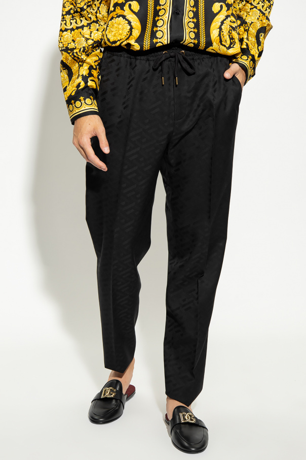 Black trousers from Versace. Made from wool and decorated with the brand\'s La Greca pattern, this pair falls with pleated, tapered legs and features a drawstring waist accompanied by a zip fly and four slip pockets – the back one is embroidered with a logo.