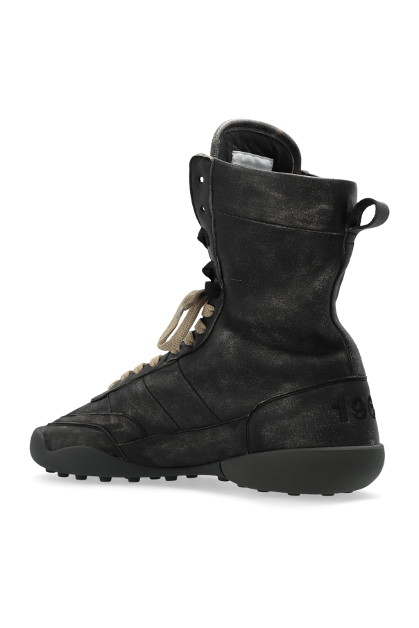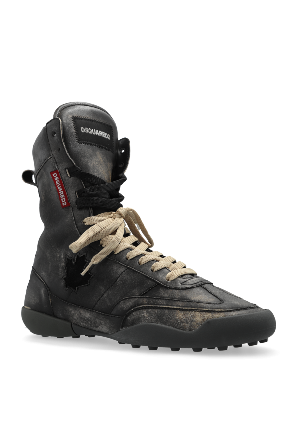 Introducing the Boxeur High-Top Sneakers by Dsquared2, an epitome of stylish athletic footwear. These exclusive sneakers feature a high-top design that extends above the ankle, providing superior support to the ankle joint. The robust sole with a pronounced tread pattern ensures exceptional grip and stability. Crafted in a sophisticated shade of gray with a distressed finish, the sneakers exude a vintage charm. The exterior is meticulously constructed from premium leather or leather-like material with a matte finish, while the interior is lined with luxurious leather for ultimate comfort. Signature details include a black maple leaf motif on the outer side, a red \"Dsquared2\" inscription on the sides, and a logo patch on the tongue. The back of the sneaker is embossed with the year \"1964,\" adding a unique touch of heritage. Light-colored laces provide a striking contrast against the darker hue of the shoes, and a practical pull tab at the top of the collar ensures easy wear. Dlaczego warto kupić ten produkt? High-top design for enhanced ankle support Premium materials for durability and comfort Unique vintage aesthetic with distressed finish Distinctive Dsquared2 branding and heritage details Exceptional grip with a sturdy, treaded sole