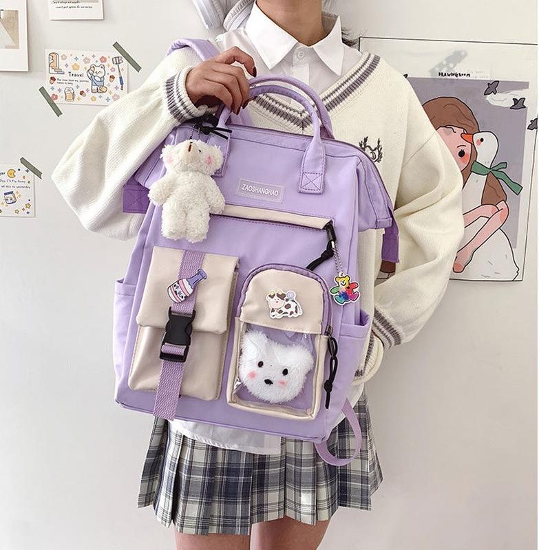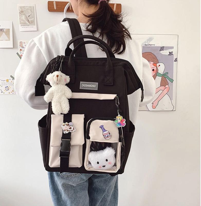 Ця модель рюкзака в японському стилі з прозорою кишенею, брелоками та іграшкою-підвіскою - популярна серед школярок 5-11 класу. Стильний, зручний та практичний рюкзак для дівчаток середньої та старшої школи . Легкий та місткий рюкзак із прозорою кишенею спереду. У ньому знаходиться фігурка Ведмедика, яку можна розташувати за своїм бажанням або додати свої елементи. Рюкзак відмінно адаптований для необхідних речей - ланчбоксу, термосу, підручників, документів (сумісний з розміром А4), речей для тренувань. Також ідеальний варіант для походів та далеких поїздок. Подарунок при покупці - набір значків, які можна прикріпити/зняти за бажанням, а також Ведмедик - підвіска і ведмедик-мордочка. Відмінний настрій забезпечено! Основне відділення широко розкривається і воно дуже містке з ущільненим відділенням для планшету/електронної книги. Міцний матеріал, що не промокає не доставляє особливого клопоту в догляді за рюкзаком. Наявність безлічі зовнішніх і внутрішніх кишень: на замках і відкритих. Металева фурнітура, цікавий дизайн і при цьому універсальність і місткість - рюкзак заслуговує високої оцінки. ## ## Цей сучасний шкільний рюкзак для дівчаток 5-11 класу відмінно поєднується як з повсякденним гардеробом, так і зі спортивним стилем. Рюкзак виглядає дуже стильно и модно. Дозвольте собі виглядати яскраво, не бійтеся експериментувати. За спиною повинні бути крила та крутий рюкзак!))) ## ## ## - ## Ми співпрацюємо з перевіреними фабриками-виробниками, продаємо тільки висококласну продукцію. - ## Ми відповідаємо за кожну окрему товарну позицію і гарантуємо її високу якість і практичність. Характеристики: - ## Тип рюкзака: шкільний рюкзак, сумка-портфель - ## Розмір: 38 х 26 х 18 см - ## Вага: 450 гр - ## Матеріал: міцний текстиль - ## Підкладка: поліестер - ## Основне відділення на блискавці - ## Регульовані шлейки - ## Колір: чорний, рожевий, бузковий, хакі - ## Іграшки-ведмедики и 3 значки - в комплекті Замовляйте модель, що сподобалась , залишайте відгуки та отримуйте знижки!
