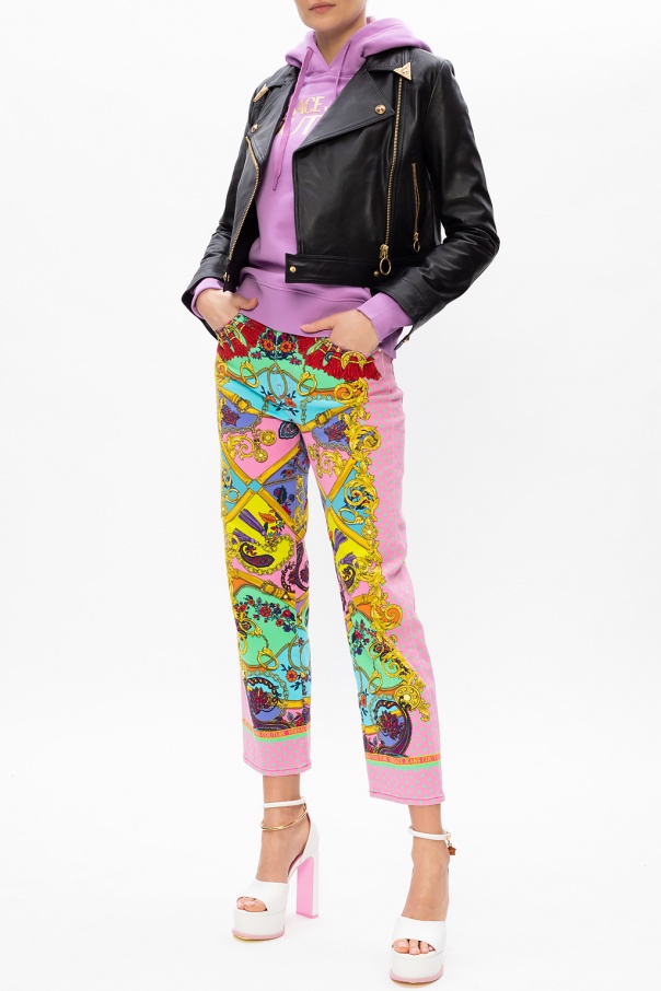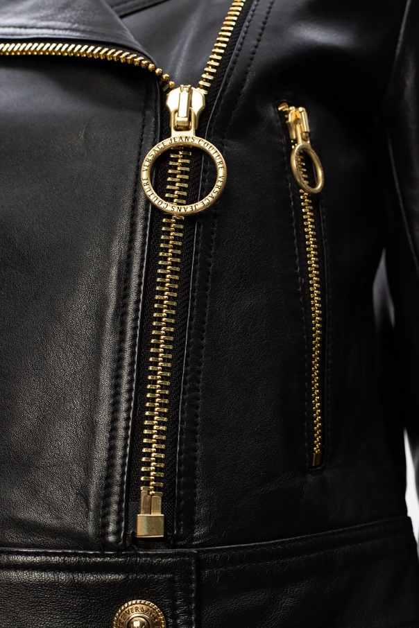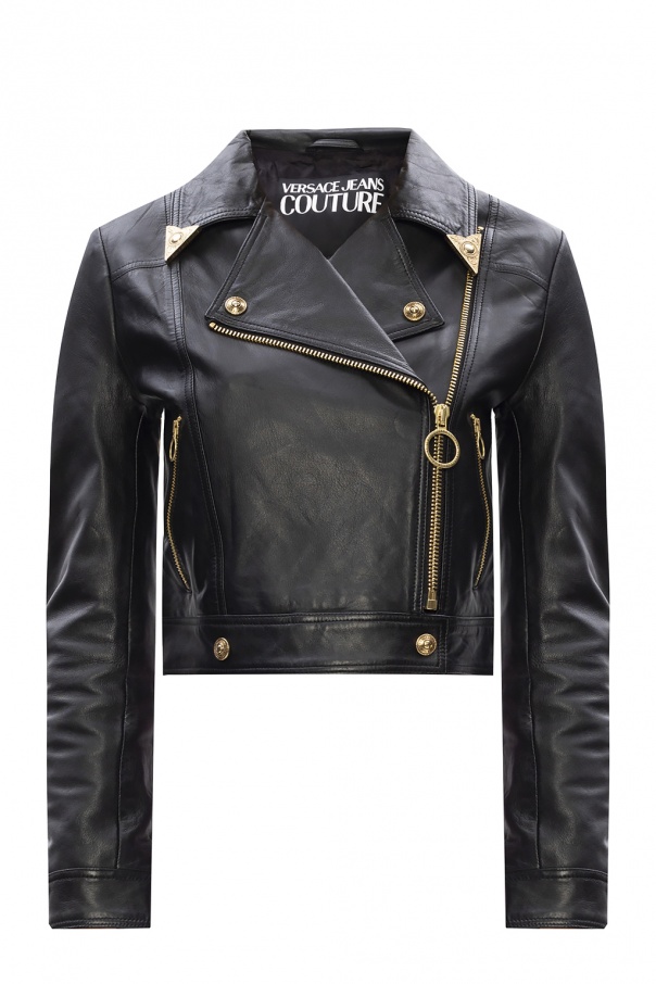 Black biker jacket from Versace Jeans Couture. Enriched with decorative appliqués, this lamb leather-crafted design fastens via a zip and employs two zipped pockets on the front and long sleeves with zipped vents and snap-fastened cuffs.