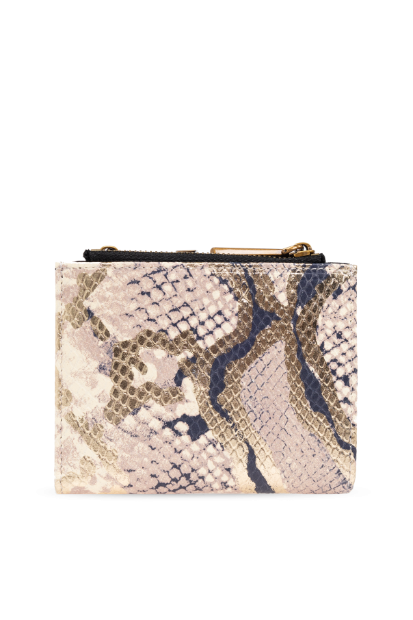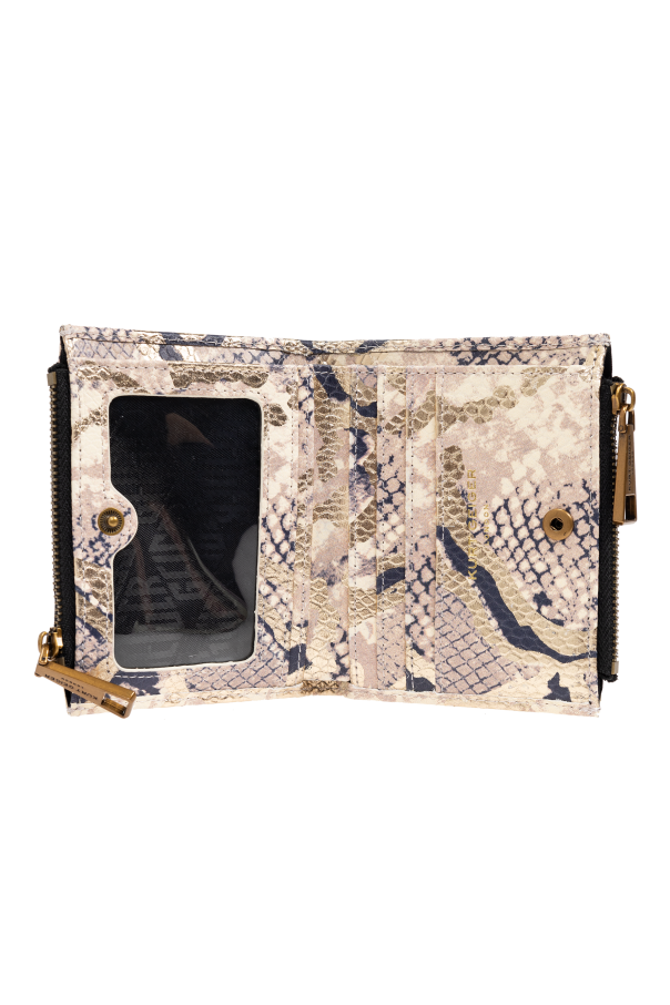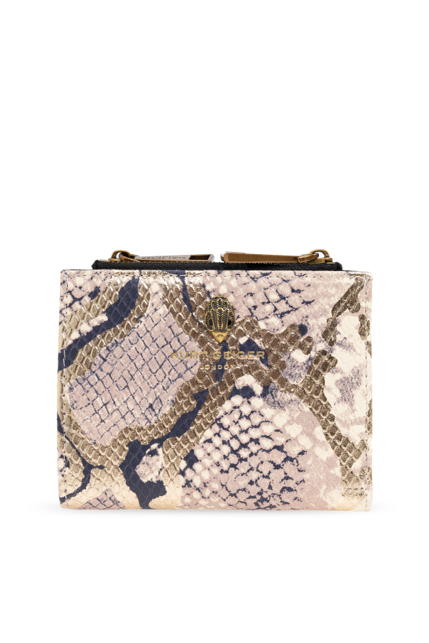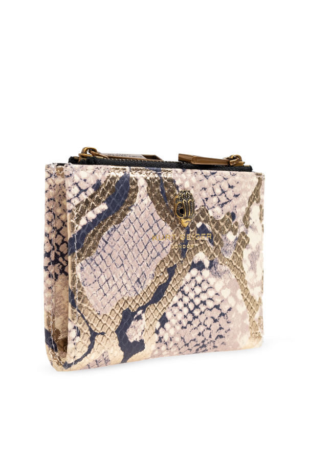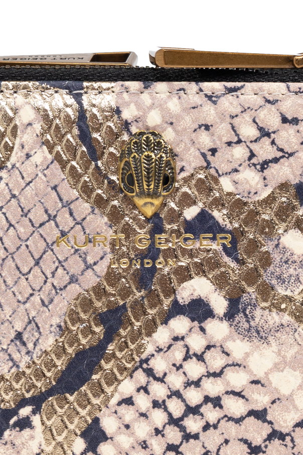 Introducing the Snake-Patterned Leather Wallet by the illustrious designer Kurt Geiger, a paragon of elegance and utility. This exquisite accessory boasts a sophisticated animal motif, artfully mimicking the texture of snake skin, with a captivating palette of beige, gold, and navy hues. The asymmetrical pattern enhances its authentic allure, making it a standout piece in any collection. Adorning the front is the iconic golden logo of Kurt Geiger, symbolizing the brand\'s legacy and featuring an eagle-like emblem. Designed with the discerning fashionista in mind, this wallet is equipped with multiple card slots and a transparent pocket for documents, ensuring meticulous organization. The combination of a secure zipper and snap closure safeguards your essentials with style. Craftsmanship is evident in every stitch, reflecting the hallmark quality of exclusive brands. Perfectly blending functionality with chic aesthetics, this wallet is a quintessential addition to your accessory repertoire. Why Choose This Product? Distinctive snake-patterned design in a striking color scheme. Premium craftsmanship with Kurt Geiger\'s signature style. Practical features including multiple card slots and a transparent pocket. Secure closure mechanisms for peace of mind.
