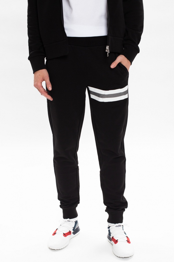 Black sweatpants from Moncler. Printed with the brand\'s logo and grey and white stripes, this cotton-crafted pair is complete with an elasticated waistband with a drawstring fastening, two side seam pockets, one welt back pocket and elasticated leg openings.
