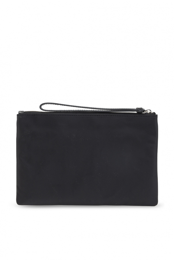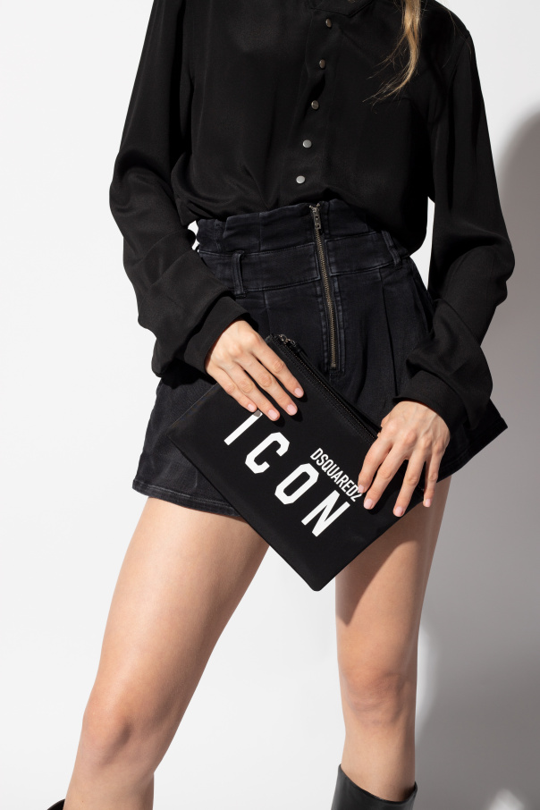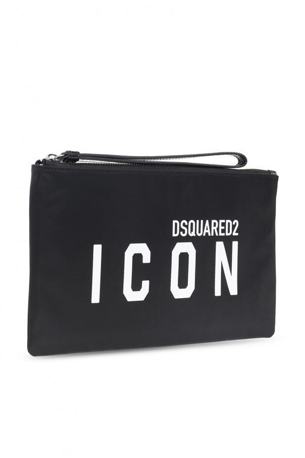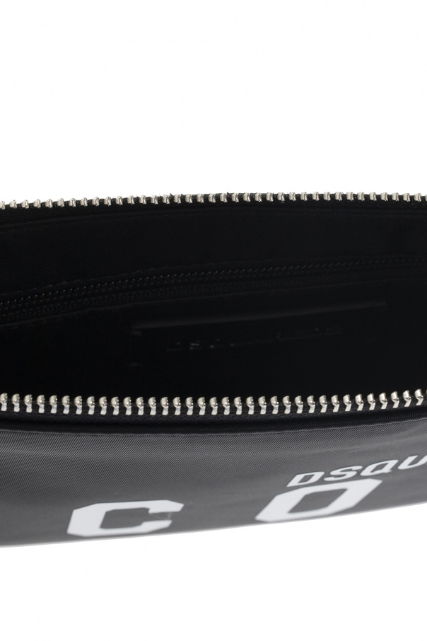 Black hand bag from Dsquared2. Fastened with a zip, this model features a white logo print, wrist strap, silver-tone metal hardware and one internal compartment with one zip pocket.