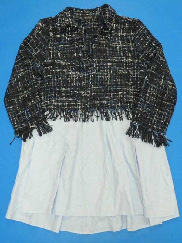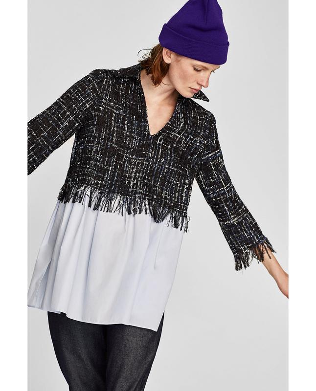 Эффектный твидовый топ с бахромой из фактурной ткани,и имитирующей под низом хлопковую блузку. V-вырез на груди. Рукав 3/4. В живую очень стильно и респектабельно. Размер указан XS ПОГ - 46 см Длина - 75/80 см Рукав - 50 см с учетом бахромы Изначальная цена такой была около 1500 грн https://lovethebrands.com/products/zara/tweed-top-with-contrasting-poplin/Syx_pvMmRb