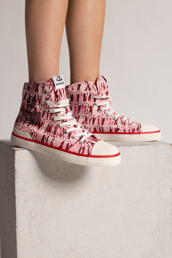 White and red ‘Benkeenh’ high-top sneakers from Isabel Marant. Made of tie-dyed cotton, this lace-up pair sits on a white rubber sole and features a tongue logo patch and a white ribbed rubber toe cap.