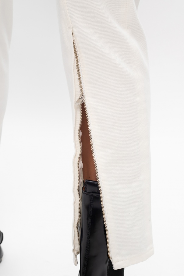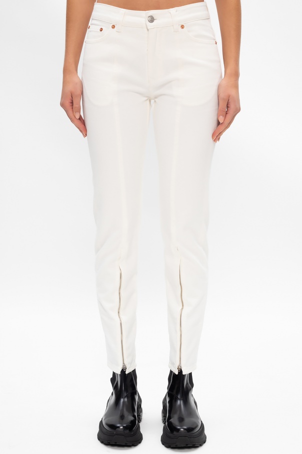 White jeans from MM6 Maison Margiela. Cut from cotton denim, this tapered pair features zip fly with top button fastening, classic five pockets, stitching detail along the legs and zipped cuffs.