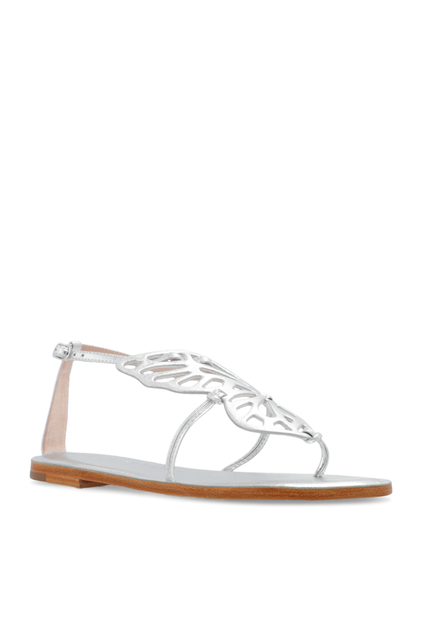 Silver-tone ‘Butterfly’ sandals from Sophia Webster. Made of leather with a metallic finish, this design features an adjustable buckled ankle strap, the brand’s signature butterfly wings and beige sole constructed from leather and rubber.