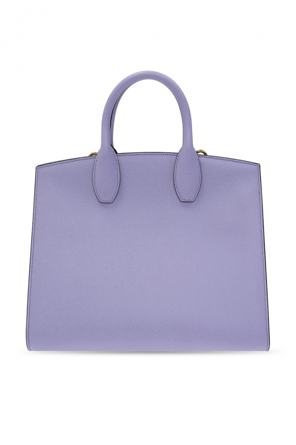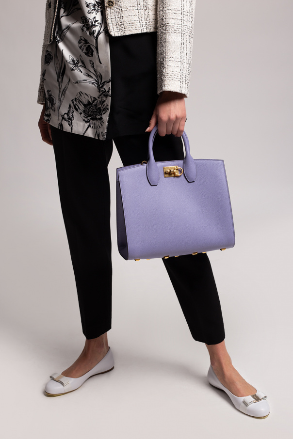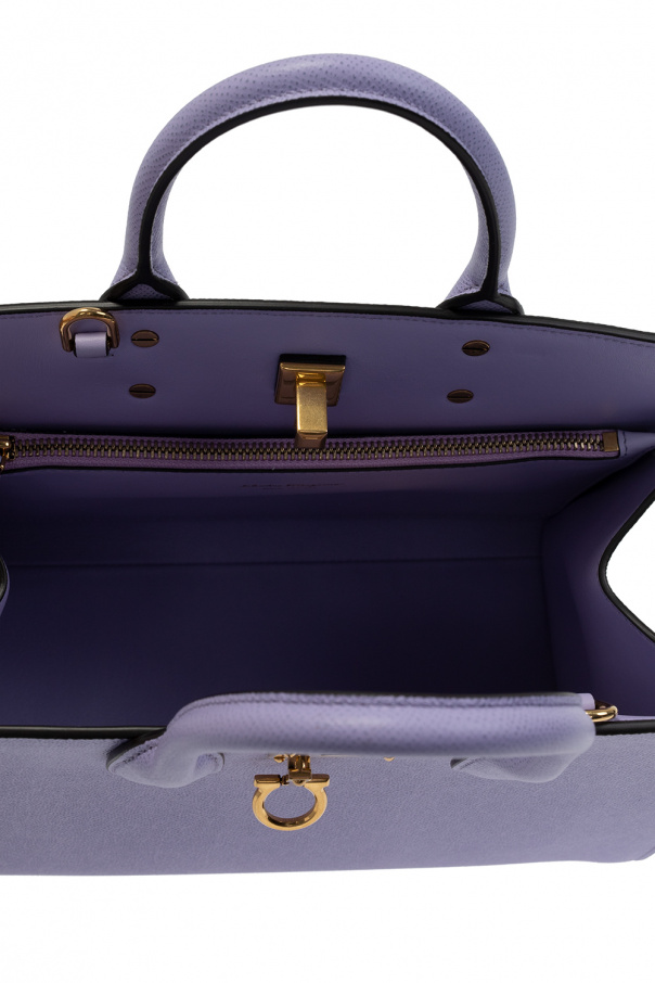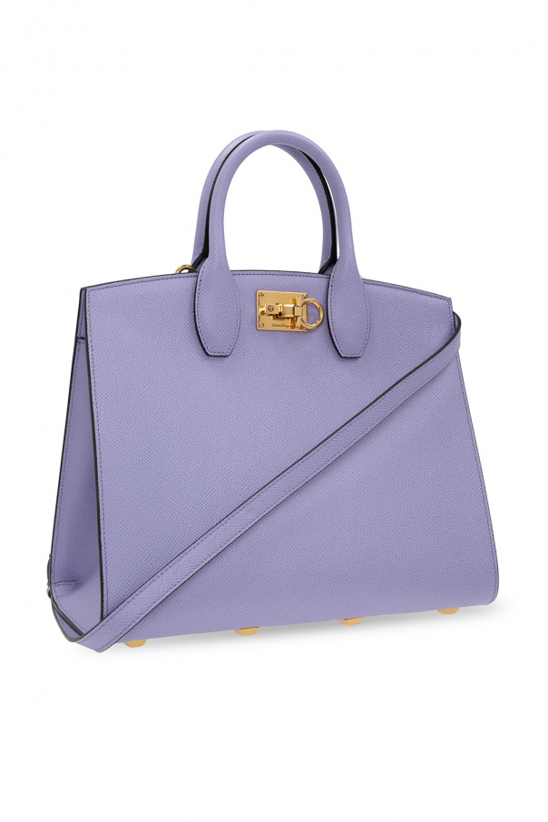 Purple ‘The Studio’ shoulder bag from Salvatore Ferragamo. Crafted from calf leather, this design features a decorative logo closure, two half-round handles, detachable and adjustable shoulder strap and gold-tone metal hardware. It has one internal compartment with one slip pocket, two card slots and a removable zipped pouch.