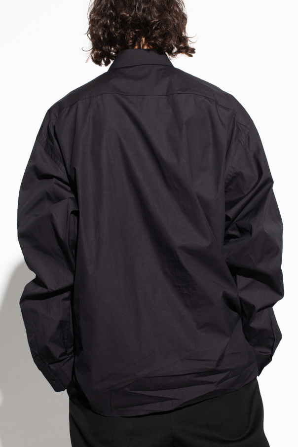 Black shirt from Balenciaga. Made of cotton, this style features button fastenings, long sleeves with button cuffs, a slip chest pocket and a white and red graphic print with the brand\'s logo.