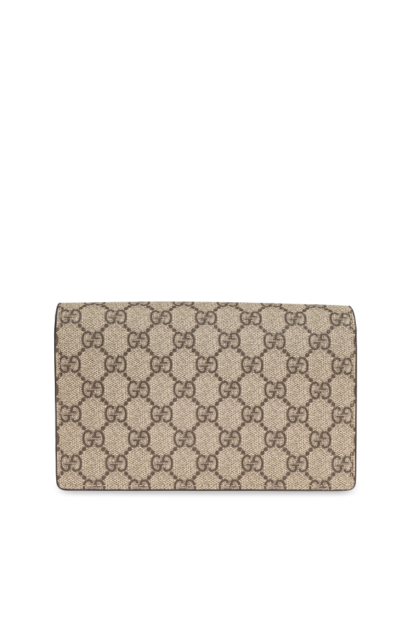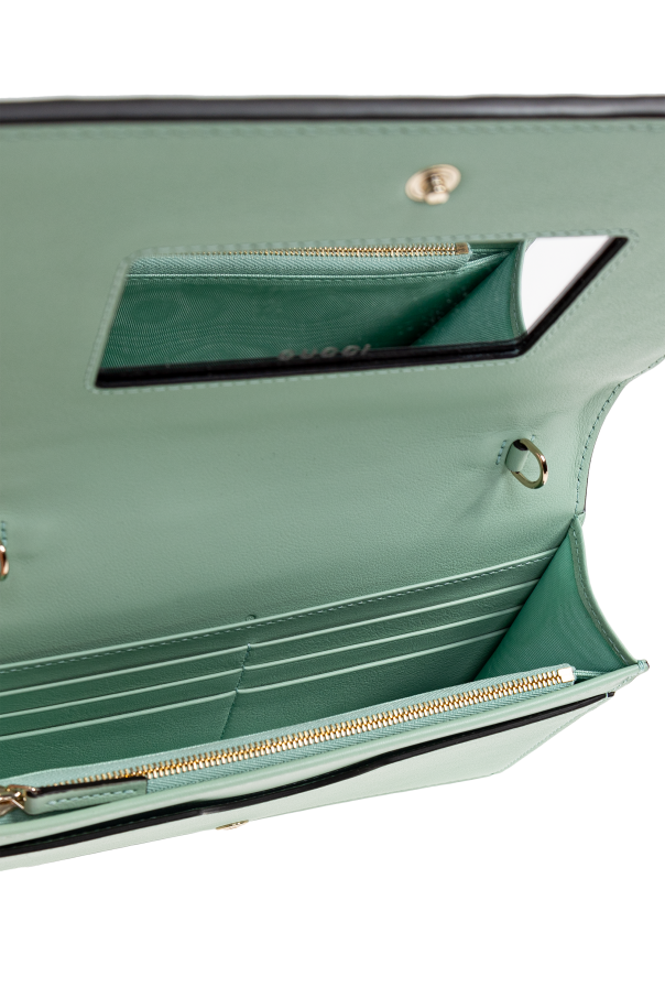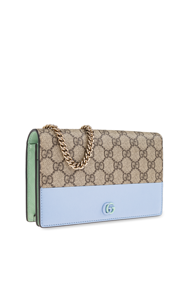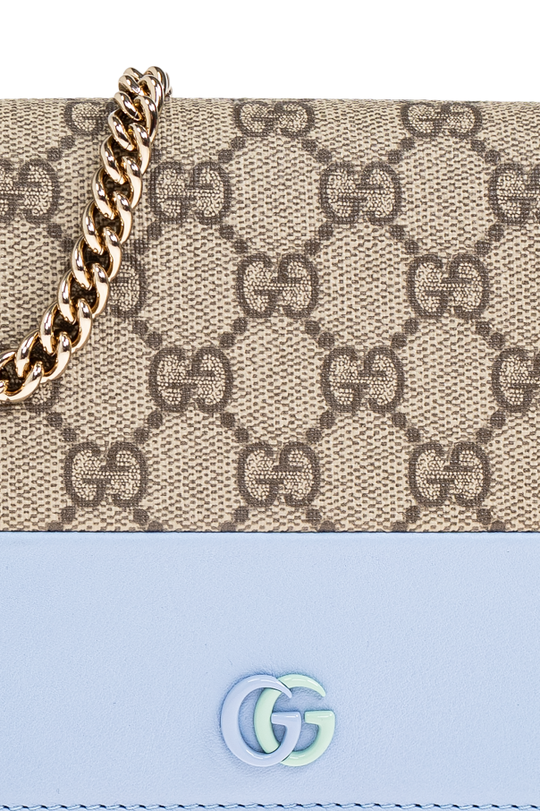Introducing the GG Marmont Chain Wallet, an epitome of opulent fashion from the illustrious house of Gucci. This exquisite accessory features a sophisticated beige hue adorned with the iconic \'GG\' monogram, beautifully contrasted by a light blue base. An elegant silver \'GG\' emblem graces the front, complemented by a lustrous gold chain, serving as a chic strap. Crafted from premium leather and canvas, the wallet\'s exterior embodies luxury, while the interior in a vibrant green shade offers unparalleled practicality. Inside, find a thoughtfully designed space: a snap closure compartment, a zippered pocket, two slip pockets, and six card slots, all meticulously tailored for your convenience. A petite mirror adds a touch of indulgence. Under the visionary helm of creative director, Gucci redefines contemporary elegance, merging innovation with traditional Italian craftsmanship. This wallet is a testament to that legacy, seamlessly blending style with functionality, suitable for both daily use and special occasions. Why Choose This Product? Iconic Design: Signature \'GG\' monogram and silver emblem. Versatile Use: Perfect for everyday elegance and special events. Quality Materials: Luxurious leather and canvas construction. Functional Interior: Snap closure, zip pocket, card slots, and a mirror. Innovative Aesthetic: A creation by renowned designer creative director.