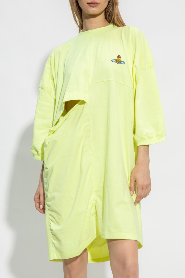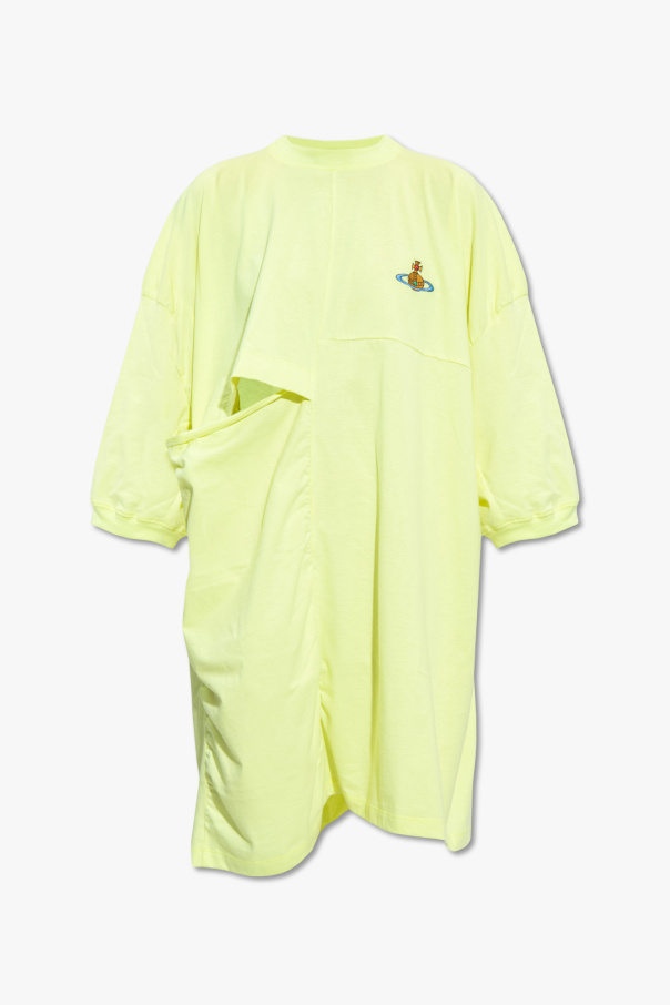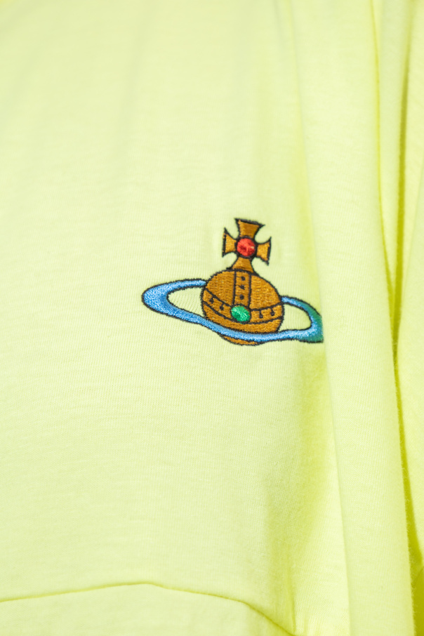 Neon yellow ‘Dolly’ crewneck T-shirt from Vivienne Westwood. Crafted from organic cotton with an oversize fit, this style features colourful logo embroidery on the front, slashes on the front and back, short sleeves and ribbing on the collar.