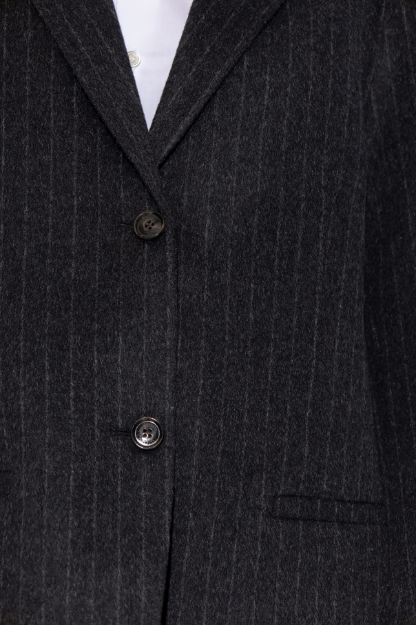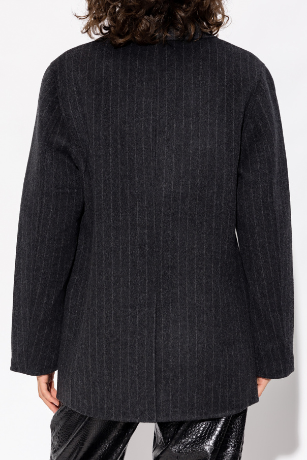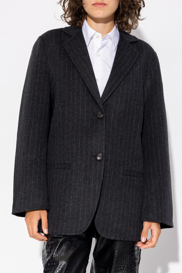 Dark grey blazer from Toteme. Crafted from wool with a relaxed fit, this style features a pinstripe pattern, button fastenings, notch lapels, two slip pockets, long sleeves and a single back vent.
