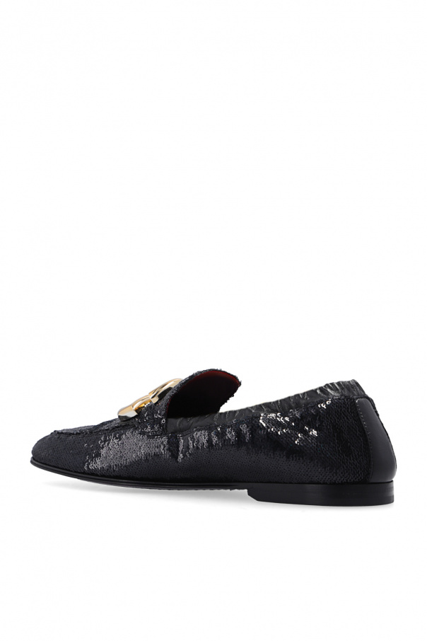 Black ‘Ariosto’ shoes from Dolce & Gabbana. Made of leather embellished with sequins, this pair features a gold-tone logo appliqué and purple rubber sole.