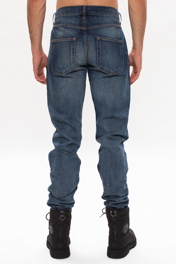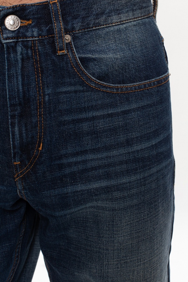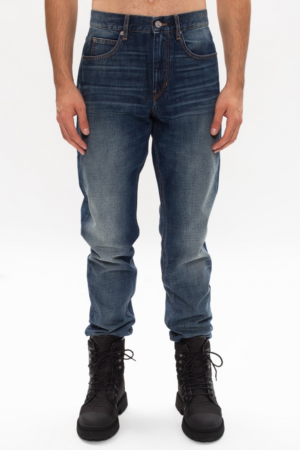 Dark blue jeans with a worn effect from Isabel Marant. Fastened with a zip and button, this tapered leg design features orange stitching details, three front pockets and two back pockets.