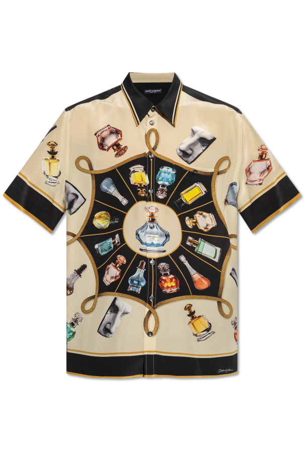 Introducing the Silk Shirt with Pocket by the illustrious Dolce & Gabbana, a masterpiece of sartorial elegance and modern flair. This exquisite shirt features a multicolored design on a beige canvas, adorned with opulent graphics depicting perfume bottles and luxurious artifacts, symmetrically arranged for a striking visual impact. Crafted from the finest silk, this short-sleeved shirt with a classic collar epitomizes luxury and sophistication. Its subtle Dolce & Gabbana logo at the hem and the black finish with a thin gold stripe on the sleeves and hem accentuate its branded allure. Perfect for elegant yet informal occasions, this casual piece stands out with its sumptuous material and captivating patterns, making it a unique addition to any wardrobe. Why Choose This Product? Exclusive Design: Features a unique, luxurious print. Premium Material: Made from 100% silk for a soft, opulent feel. Brand Prestige: Subtle logo enhances its exclusive appeal. Versatile Styling: Ideal for stylish, informal settings.