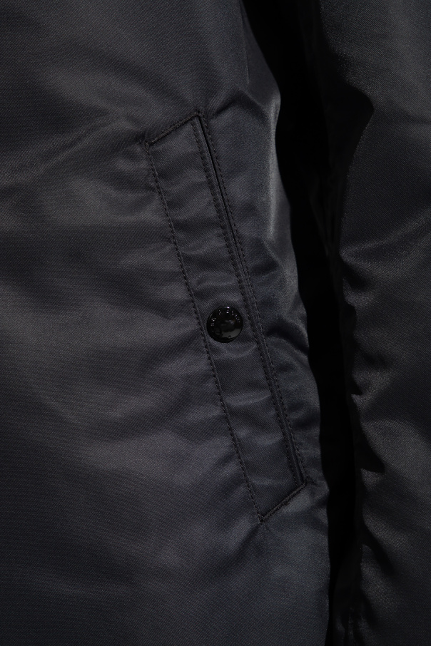 Black ‘Manston’ jacket from Rag & Bone. Crafted from recycled material, this style fastens with snaps and features a drawcord-adjustable hem, two snap-fastened pockets, orange lining and long sleeves with snap-fastened cuffs.