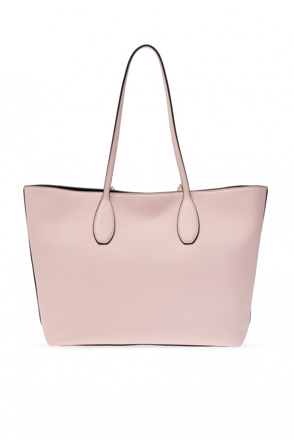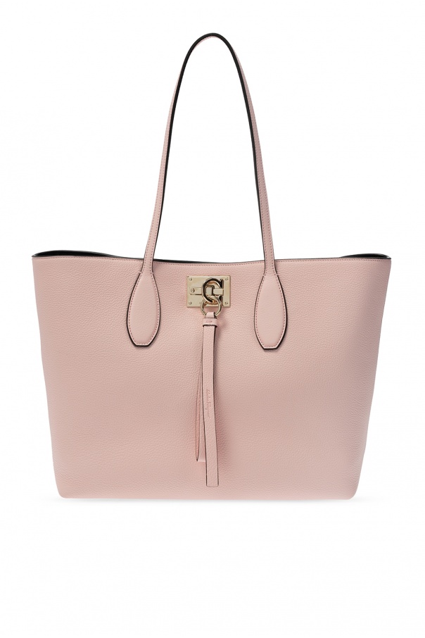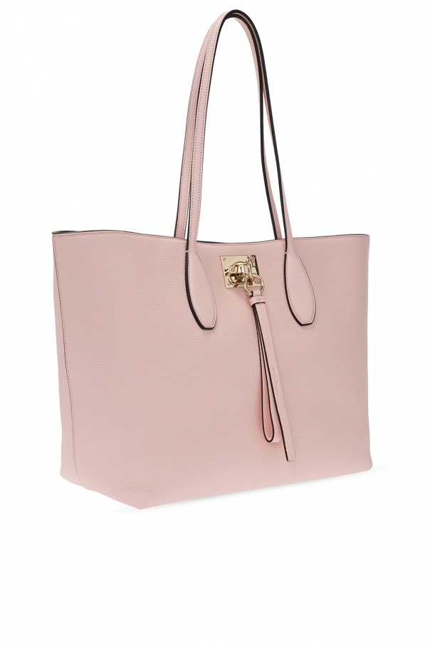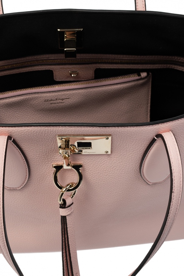 Light pink ‘The Studio’ shopper bag from Salvatore Ferragamo. Crafted from calf leather, this design features a logo-embossed closure, leather charm, two half-round handles, gold-tone metal hardware, removable zipped pouch and one internal with one zip pocket.