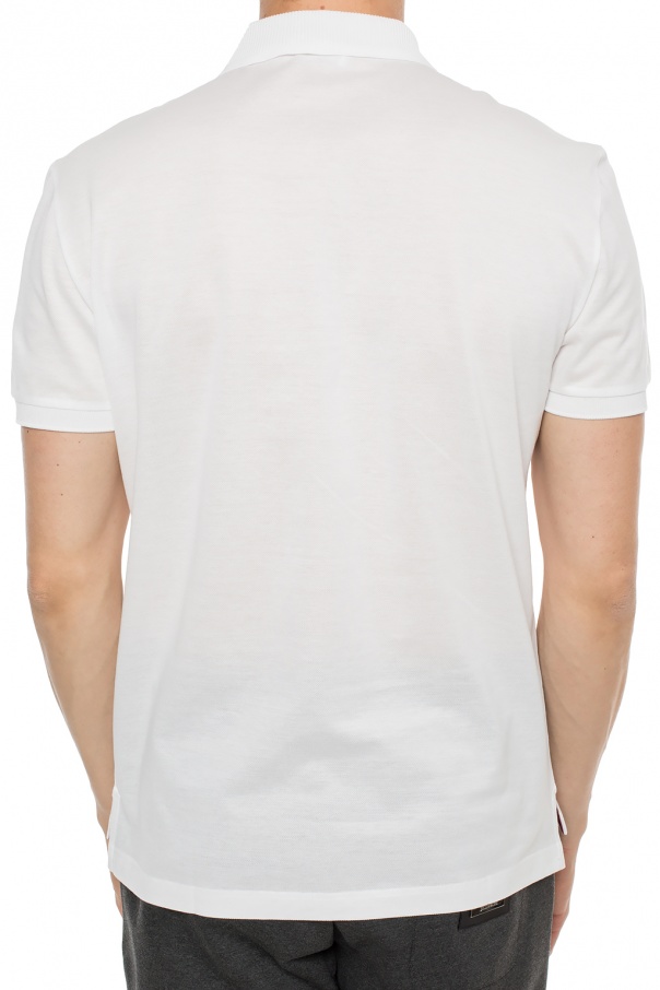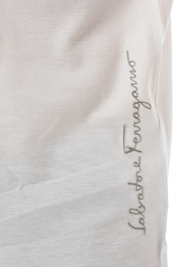 White polo shirt from Salvatore Ferragamo. Made of cotton. Button fastening. Front decorated with a grey logo embroidery. Short sleeves.